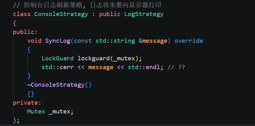 LockGuard lockguard(_mutex),就是我们之前用的 Mutex + LockGuard 多线程安全锁。因为多线程同时写日志 → 会导致输出穿插、乱码。因此这里每个策略对象自己有一个 mutex 来保证线程安全。