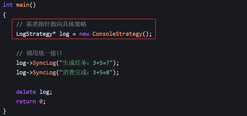第二行的 virtual void SyncLog(const std::string &message) = 0 是纯虚函数,代表 LogStrategy 是抽象类,不能实例化,只能被继承。所有子类(控制台显示器、文件、网络)都必须自己实现 SyncLog。