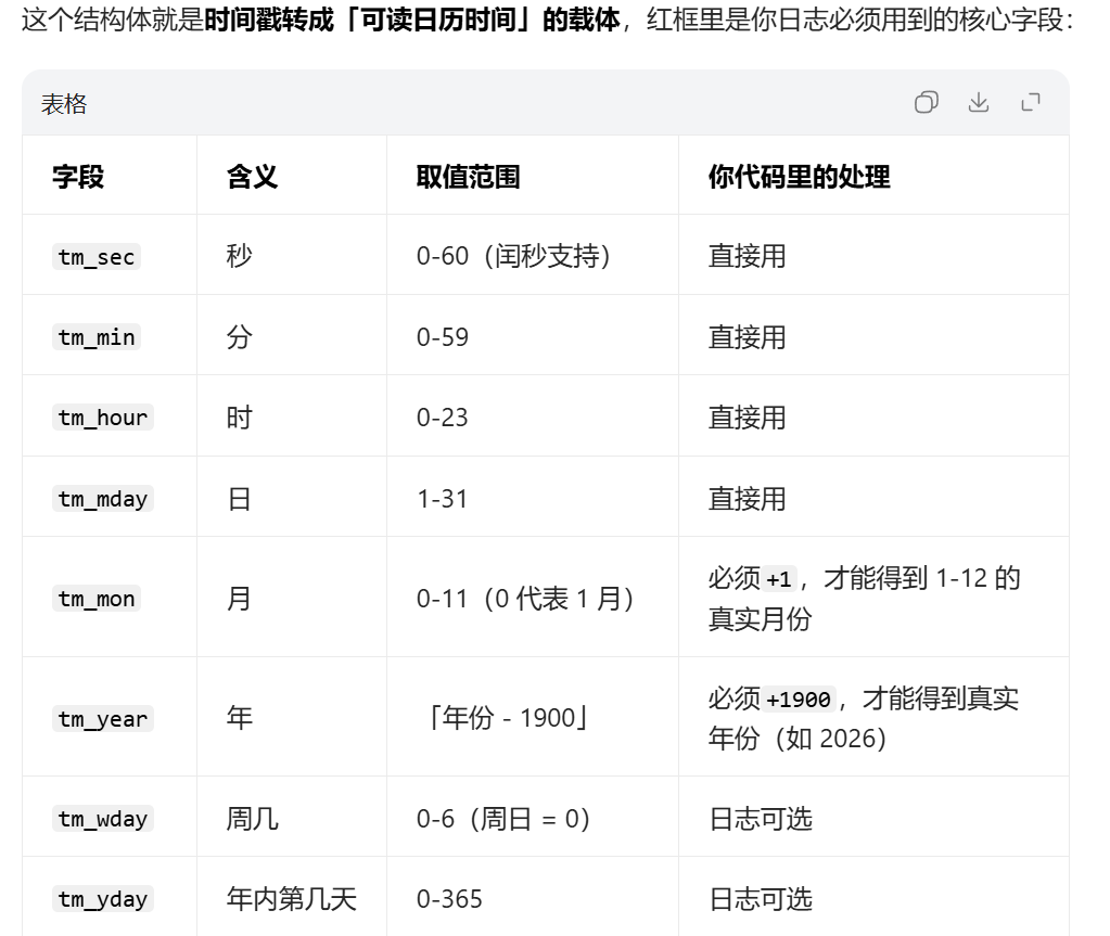 - 线程安全时间转换:使用可重入函数 localtime_r,将 gettimeofday 获取的秒级时间戳,转换为 struct tm 结构体格式的本地日历时间。区别于非线程安全的 localtime,localtime_r 要求用户传入自定义的 struct_time 结构体作为缓冲区,每个线程拥有独立的内存空间,彻底避免多线程下的数据竞争与时间错乱,完美适配多线程日志场景。