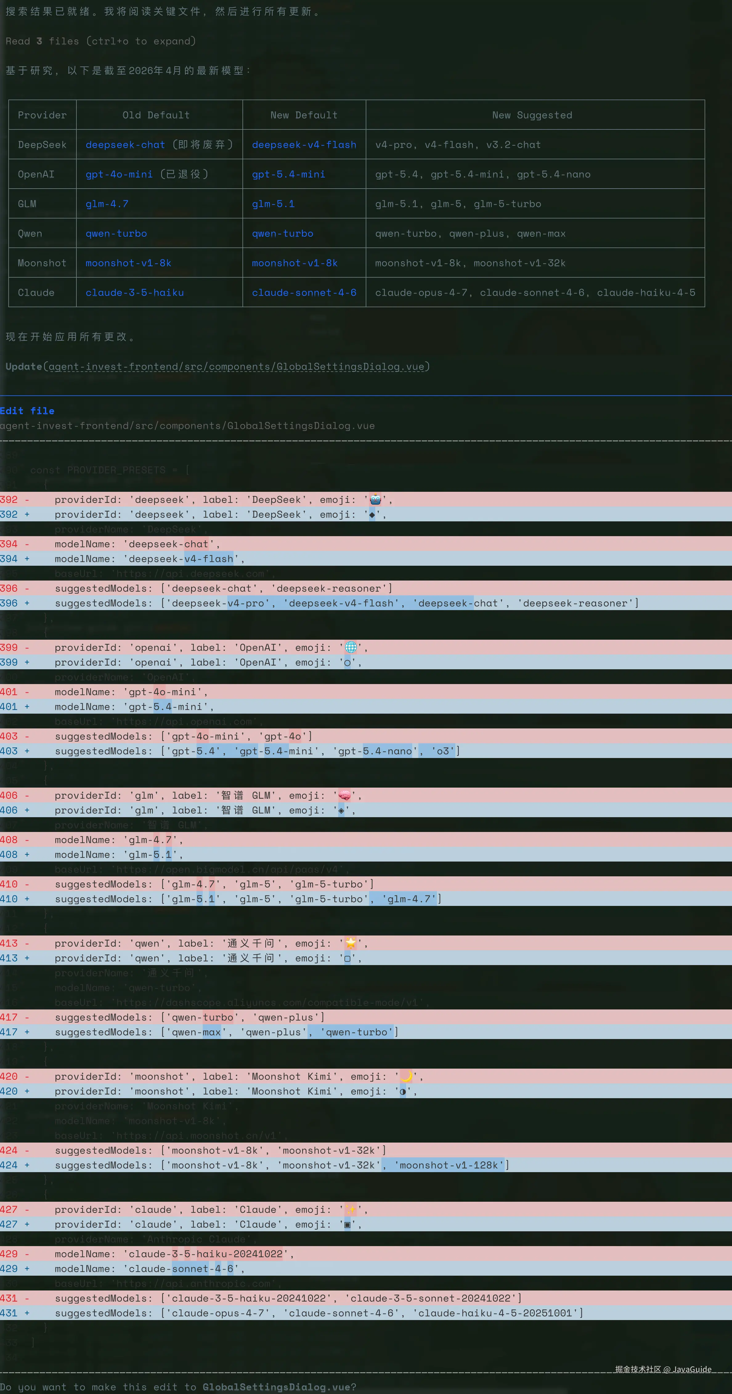 模型配置全部更新成功,各家推荐的模型示例都切到了最新版本。改了三个文件: