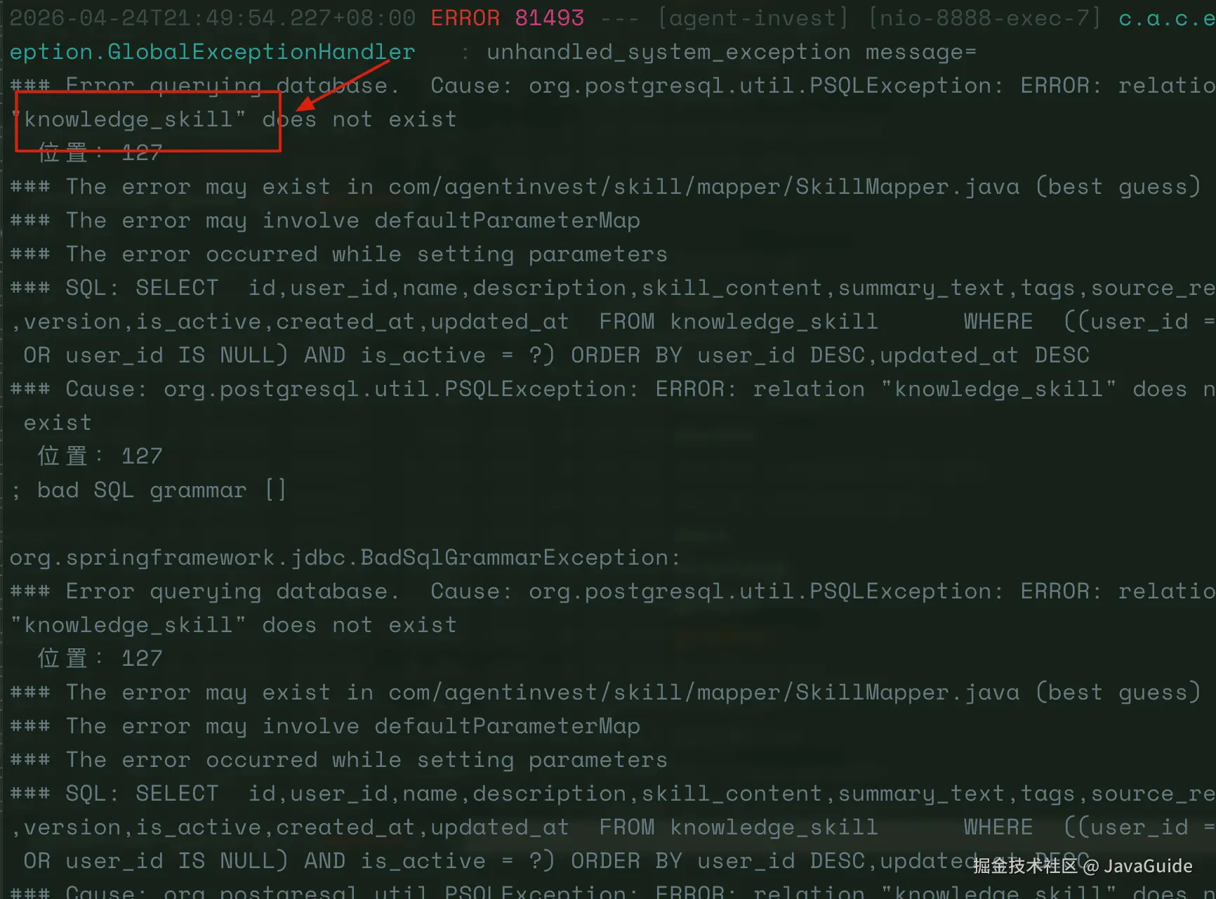 DeepSeek V4 Pro 的分析很到位: V2__knowledge_skill.sql 没有被挂载到 Docker 容器中,项目也没有引入任何数据库迁移工具 ,而 init.sql 是在容器启动时自动执行的------这是 Docker Compose 配置里写死的。