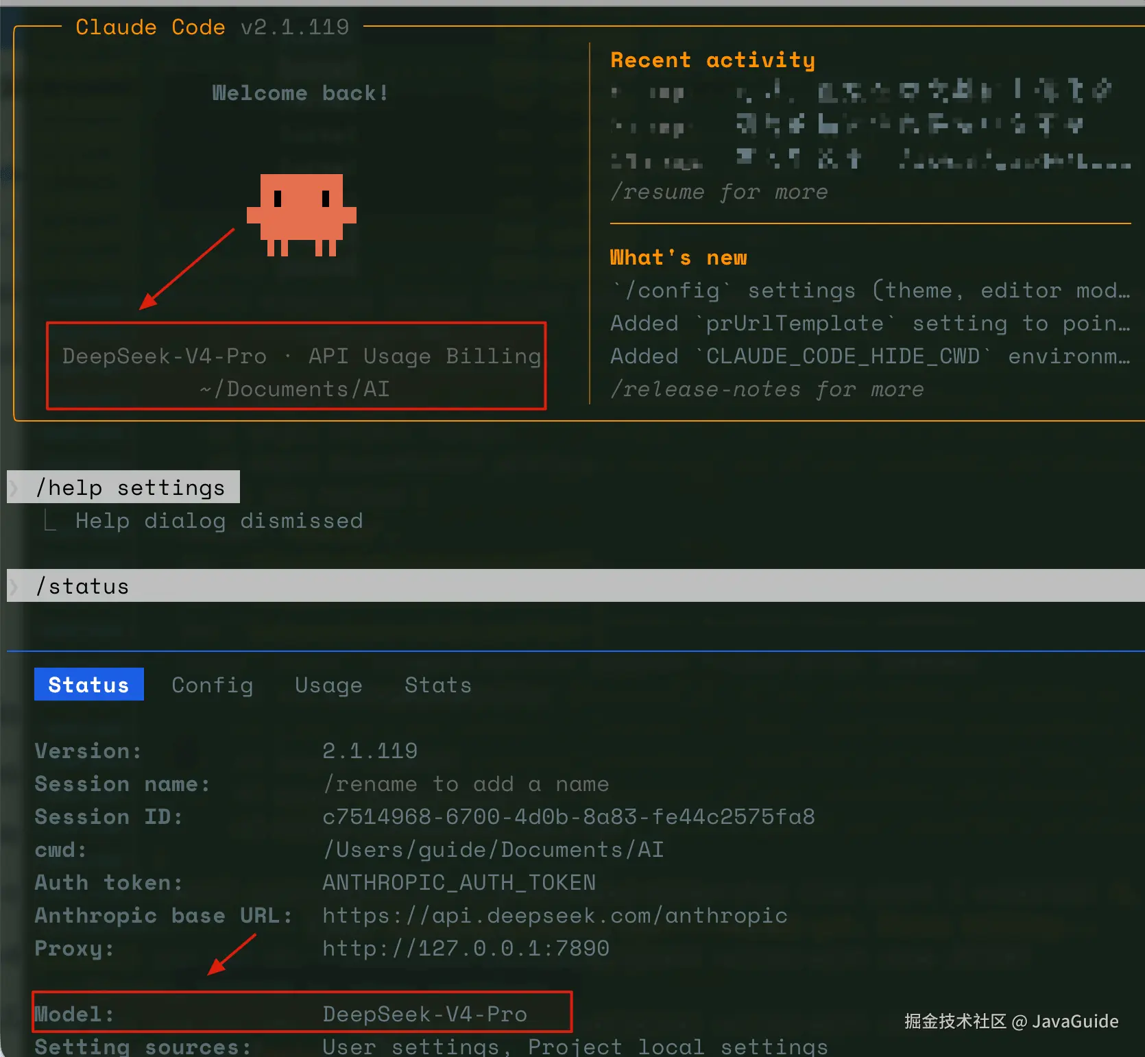 直接在命令行输入 claude 或者进入 Claude 界面之后再次输入 /status 确认,model 为 DeepSeek-V4-Pro 即表示接入成功。