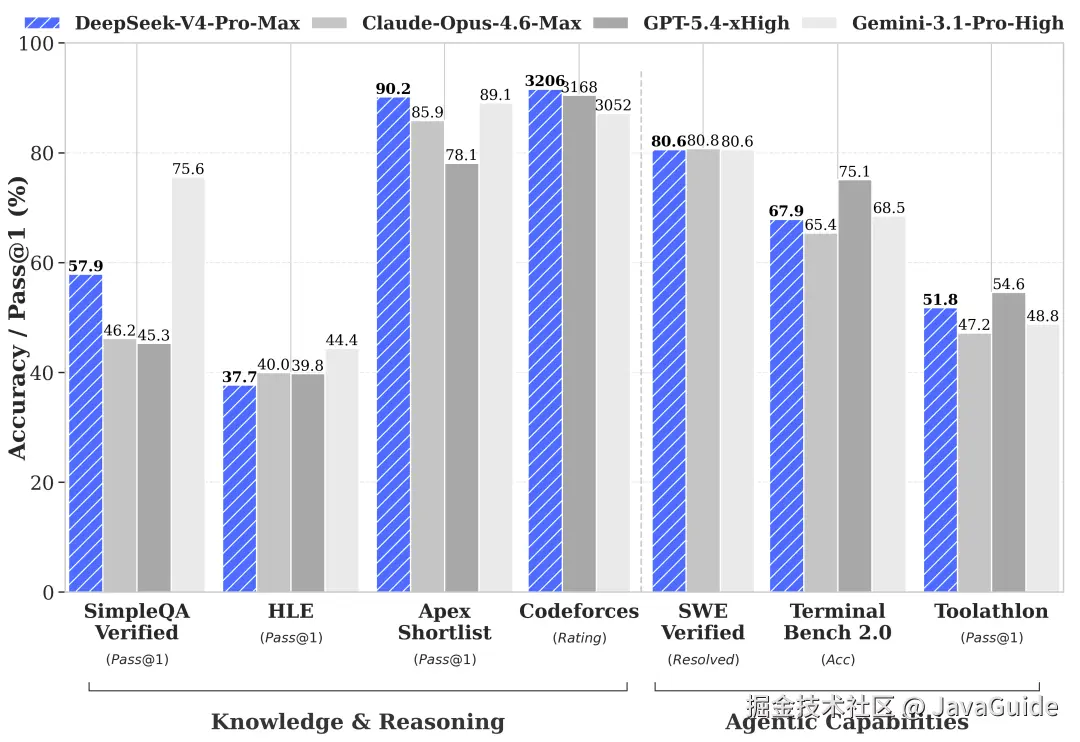 - V4-Pro 的 Codeforces 评分 3206 ,在四家主流模型(Claude Opus 4.6、GPT-5.4 xHigh、Gemini 3.1 Pro High)中排第一