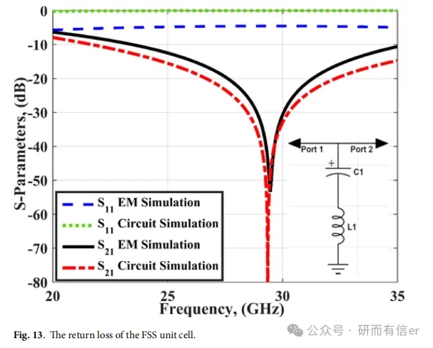 解析:FSS单元在24--35 GHz范围内表现为带阻滤波器,反射后向辐射,提升前向增益。