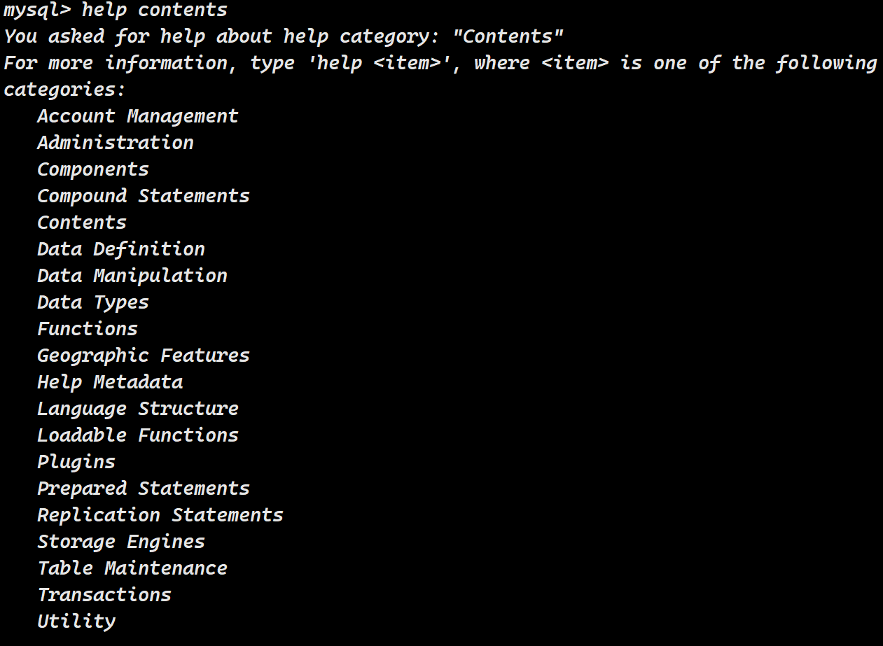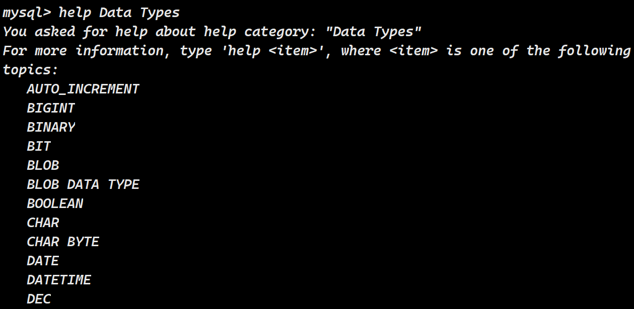 group\] --- 节点 **设置选项的程序或组的名称,不区分大小写。** ++如果选项组名称与程序名称相同,则组中的选项专门应用于该程序,例如,\[mysqld\]和\[mysql\]组分别适用于mysqld服务端程序和mysql客户端程序++ opt_name 相当于命令行上的选项名 opt_name=value **选项名对应的值,可以使用转义序列\\b, \\t, \\n, \\r, \\\\ 和 \\s来表示退格符、制表符、换行符、回车符、反斜杠和空格字符** **Tips:** **1.选项名称和值中的前导和尾随空格会自动删除** **2.在Windows系统中设置路径应该使用转义字符** basedir="C:\\\\Program Files\\\\MySQL\\\\MySQL Server 8.0" basedir="C:/Program Files/MySQL/MySQL Server 8.0" *** ** * ** *** **1.\[client\] MySQL发行版中所有客户端程序都会读取并应用这个组下的选项(除了mysqld),在这个组下可以指定适用于客户端程序的通用选项,例如配置用户名和密码(要确保只有自己才可以访问这个文件,防止密码泄露)** **2.可以通过\[客户端程序名\]的形式为不同的客户端程序指定选项,例如\[mysql\],当运行mysql程序时会读取并应用该组下的配置,如果选项名与\[client\]重复,\[client\]中的选项将会被覆盖(\[客户端程序名\]优先级高于\[client\])** **1.为特定MySQL版本设置选项可以使用\[mysqld-5.7\]、\[mysqld-8.0\]的组名** **2.在选项文件中使用!include 指令来包含其他选项文件,例如!include /home/mydir/myopt.cnf(具体的配置文件路径)** **3.在选项文件中使用!includedir指令来搜索指定目录中的其他选项文件,但不保证目录中选项文件的读取顺序是否一致** 例如: !includedir /etc/mysql/conf.d/ !includedir /etc/mysql/mysql.conf.d/ **Tips:** **1.!includedir在Unix和Linux操作系统中会搜索指定目录下任何以.cnf为后缀的文件,在Windows中,会搜索指定目录下任何以.ini或.cnf为后缀的文件** **2.只会读取包含文件中当前客户端的组配置,例如当前运行的是mysql程序,那么只会读取\[mysql\]组中的选项配置** **在Windows中要确保在配置文件的最后一行加一个换行符,否则该行将被忽略** *** ** * ** *** ## mysql客户端命令 ### 命令结尾格式 ; \\g \\G > 使用mysql客户端程序连接到数据库服务器之后,可以发送SQL语句到服务器执行,并以";"(分号)、\\g 或 \\G 结束。 > > TIPS: > > 1. ; 与 \\g 结束表示以表格形式展示结果 > > 2. \\G 结束表示以行形式展示结果 > > 3. 如果当前已经输入了一部分SQL语句想重新输入可以输入 Control+C 中断当前输入 >  ### 命令列表查看 - help/-h **在当前模式下,mysql还可以通过help或者\\h来查看命令列表**   ### help contents命令 使用 help contents 命令可以**查看关于 MySQL 数据库使用的具体帮助**,包括用户管理、SQL 语法、数据类型、组件等相关内容列表。  上面是展示可以通过help能够查看的具体帮助,下面例子就是使用help去查看其中的Data Types  ## 从.sql文件执行SQL语句 ### source命令导入 ++使用场景:开发环境---\>测试环境---\>生产环境++ 有时候我们需要**从 .sql 文件执行一些 SQL 语句** ,比如**要把一个数据库从一台服务器 A 复制到另一台服务器 B** 上,那么可以**先从服务器 A 导出数据到 .sql 文件,然后在服务器 B 执行这个 .sql 文件** ,在上一小节,用 help 命令查看命令列表,可以看到有一个 source 命令如下所示:   source描述是:执行一个SQL脚本文件,以文件名作为参数 > **\\. \[sql文件的绝对路径\]** > > tips: sql文件路径这里也可以用相对路径(执行mysql的路径),为了避免错误建议使用绝对路径  ### 使用mysql客户端直接导入 直接使用 mysql 客户端程序导入 .sql 文件并执行相应的 SQL 语句,可以使用以下命令: > 1. mysql db_name \< test_file > > # 在指定的数据库下执行SQL,前提是数据库必须提前创建好 > > 2. mysql \< test_file > > # 不指定数据库,sql中必须要有use \[database_name\],来指定要操作的数据库  当然也要记得在后面加上自己的用户和密码...... 有了这个办法,就不需要登录mysql再去执行命令了,可以自己写一个对应的脚本就可以自动的帮我们完成这个任务! *** ** * ** ***