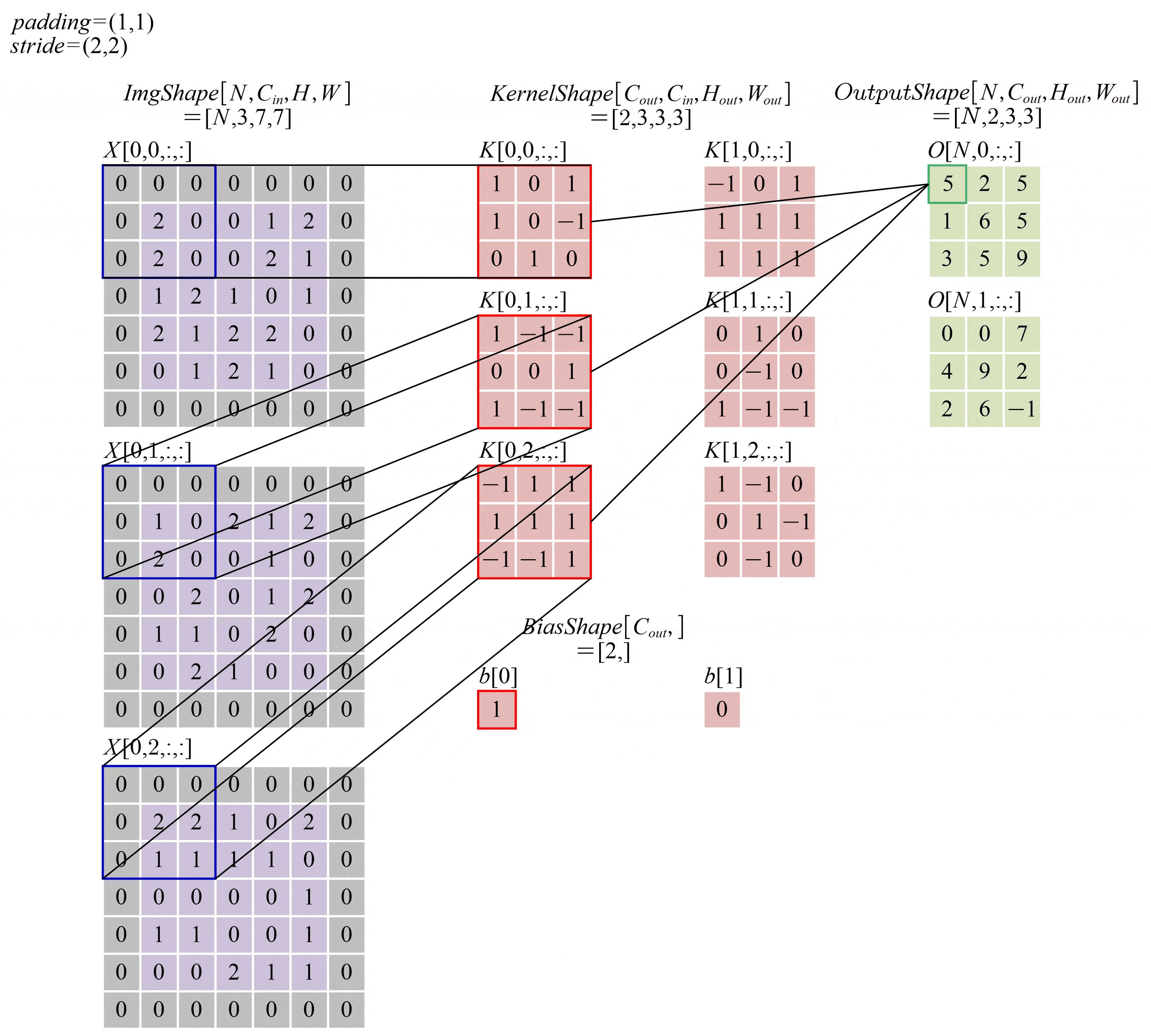 本例中,卷积结果的形状为: { H o u t = ⌊ 4 − 3 1 ⌋ + 1 = 2 W o u t = ⌊ 5 − 3 1 ⌋ + 1 = 3 \left\{ \begin{array}{l} {H_{out}} = \left\lfloor {\frac{{4 - 3}}{1}} \right\rfloor + 1 = 2\\ {W_{out}} = \left\lfloor {\frac{{5 - 3}}{1}} \right\rfloor + 1 = 3 \end{array} \right. {Hout=⌊14−3⌋+1=2Wout=⌊15−3⌋+1=3