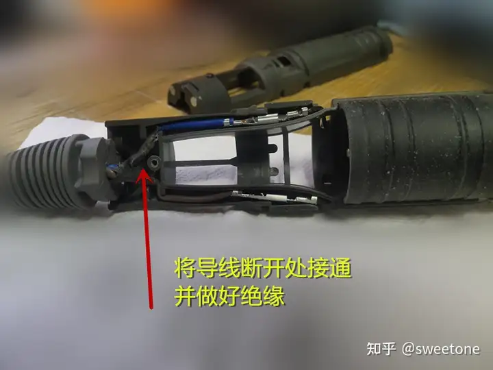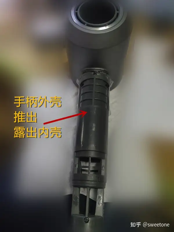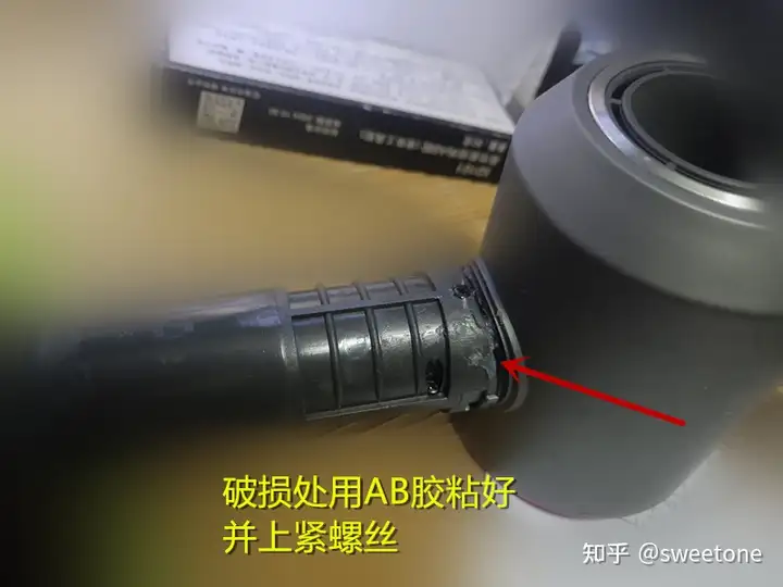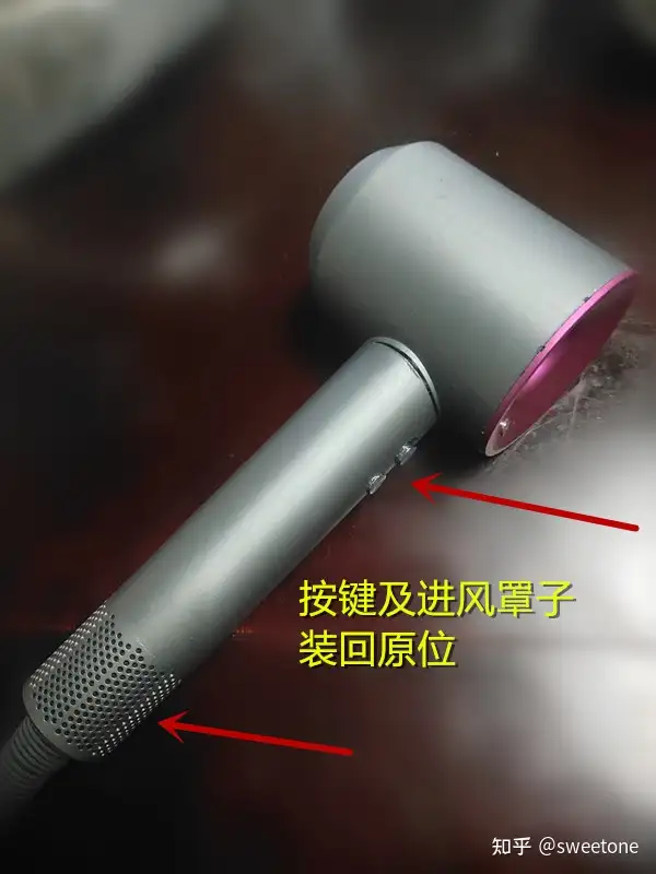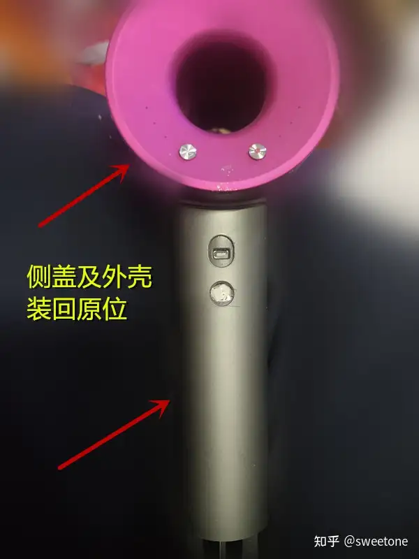 3.将风筒部件复原。将手柄部件复原,并在损伤处用AB胶水粘好,再用螺丝紧固。再装上手柄外壳及开关。