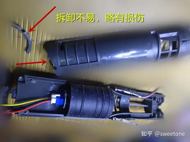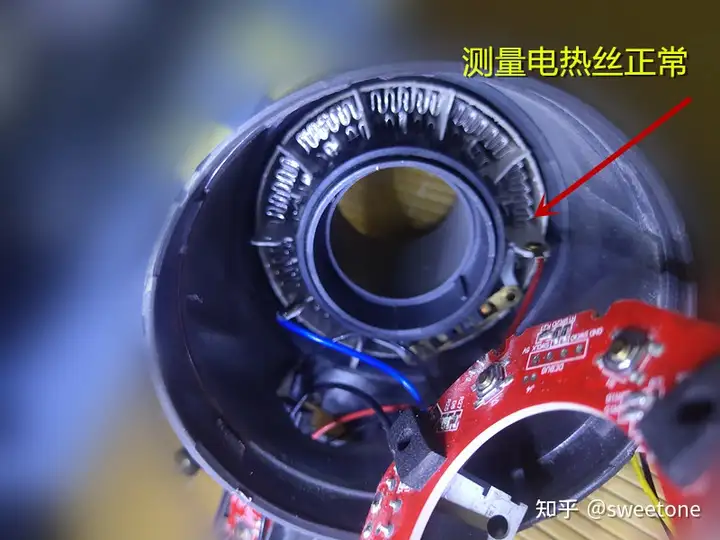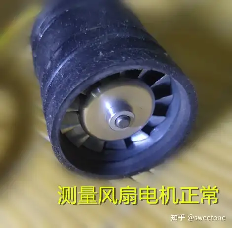 再用力将手柄外壳用力推出,即可拆出内壳结构及电机。由于此电吹风的手柄外壳装的十分紧密,用了推拉,撬动的办法也取不下。最后损伤了一点内壳的情况下,才拆下外壳取出内壳。拆下螺丝拆开内壳,用万用表测量开关,风扇电机阻值正常。
