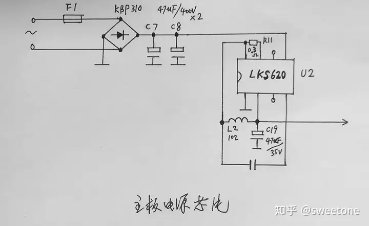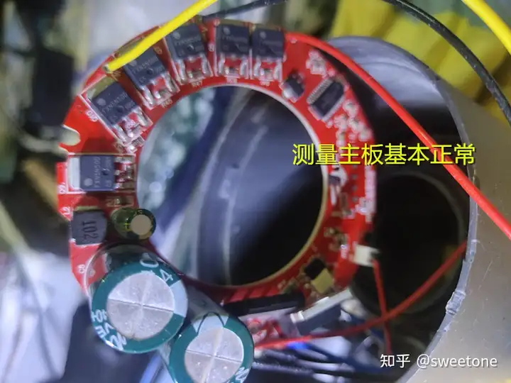 电路组成:通过查看主板,知道该电吹风的CPU是32F093M6S8B,输出调温,调速控制信号。给电热丝调温的是可控硅BT138-800E。给三相无刷电机调速的是6个5N50D功率管。主板电源芯片是LKS620。