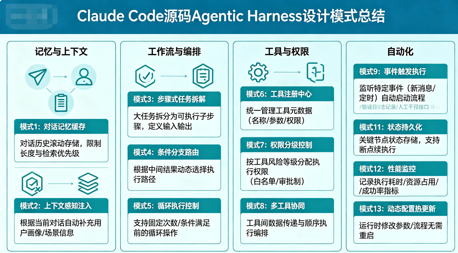 Claude Code源码泄露带来的12个Agentic Harness设计模式,并非孤立存在,而是相互配合、层层递进,共同构成了生产级Agent的底层架构体系。记忆与上下文类模式解决了Agent"记得住、记得清、不浪费"的问题,为Agent的自主执行提供了基础;工作流与编排类模式解决了Agent"有条理、不混乱"的问题,让复杂任务能有序推进;工具与权限类模式解决了Agent"能做事、不闯祸"的问题,控制了操作风险;自动化类模式解决了Agent"少出错、省力气"的问题,提升了执行效率和自主性。