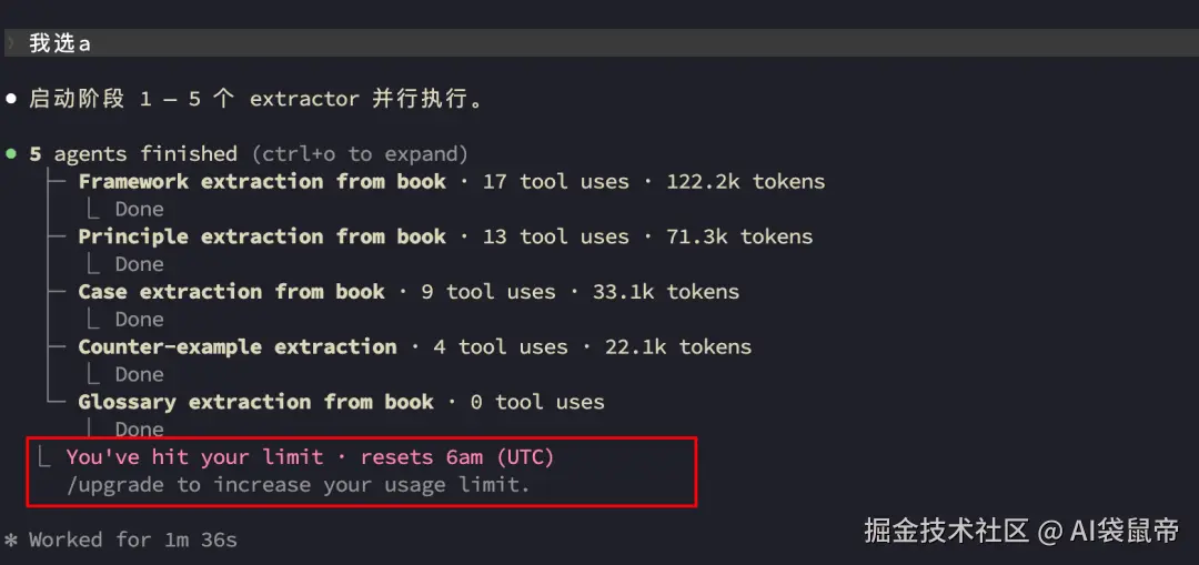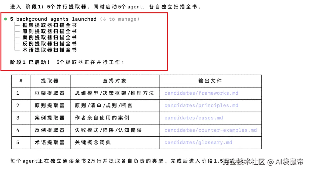 五个Agent先行扫描全文。然后一个思维框架,一个找原则,一个找作者案例,一个找反面教训,一个术语词典。各自独立工作,互不干扰。