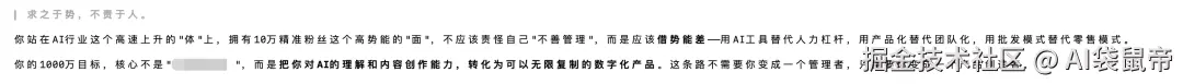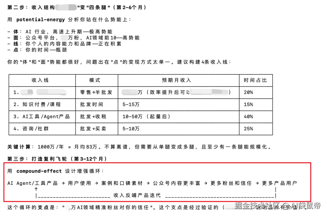 这次完全不一样,AI终于没有给正确的废话 它调用了《认知红利》里的好几个方法论框架。 给了非常实用的建议,总结下来就是需要批发时间,设计增强循环,打造复利飞轮。