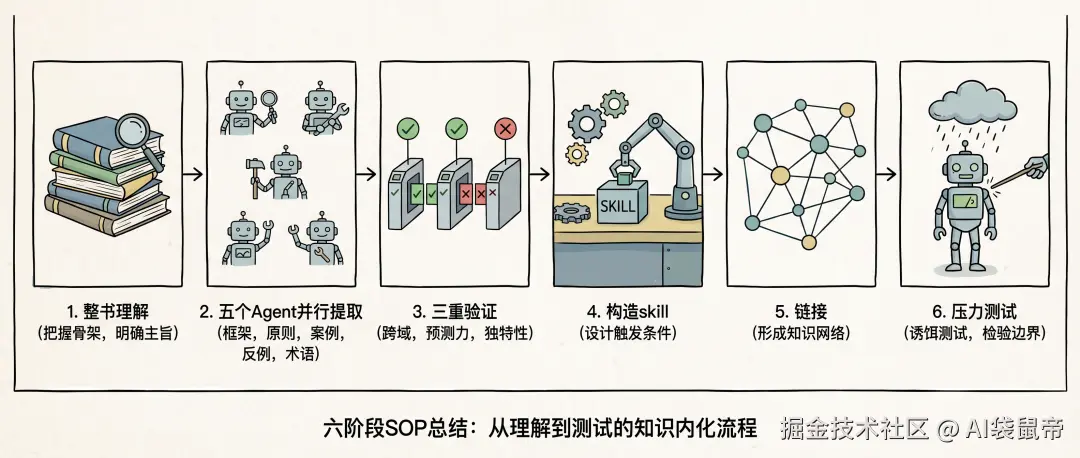 它帮我设计了一套完整的六阶段蒸馏SOP: 整书理解、五个Agent并行提取、三重验证筛选、skill构造、关系链接、压力测试。