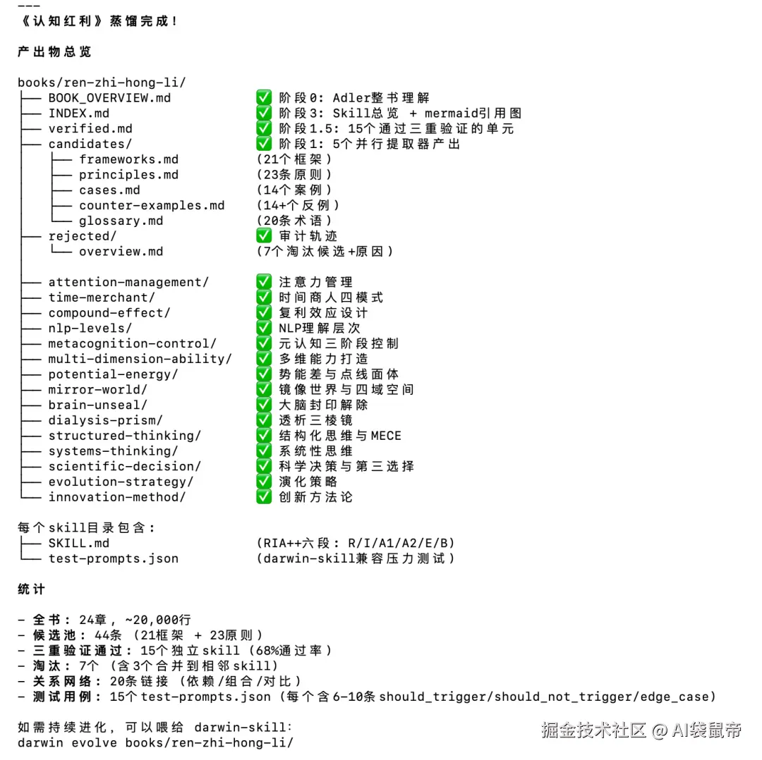 这套流程跑完,一本书会被蒸馏成一套Agent Skills,包含几个甚至几十个原子化的Skill(取决于书的知识密度)。每个Skill都能独立被调用,都有明确的适用场景和边界。