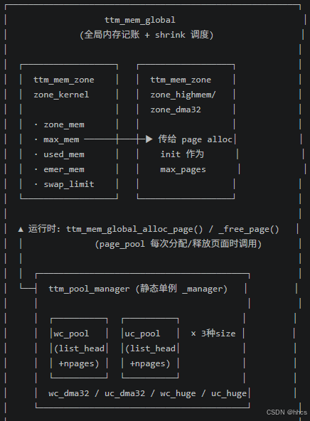 简而言之:ttm_mem_zone 是"会计",ttm_page_pool 是"仓库" 。它们不直接引用对方,而是都通过 ttm_mem_global 这个全局协调者进行间接协作------仓库每次进出货物都会通知会计记账。