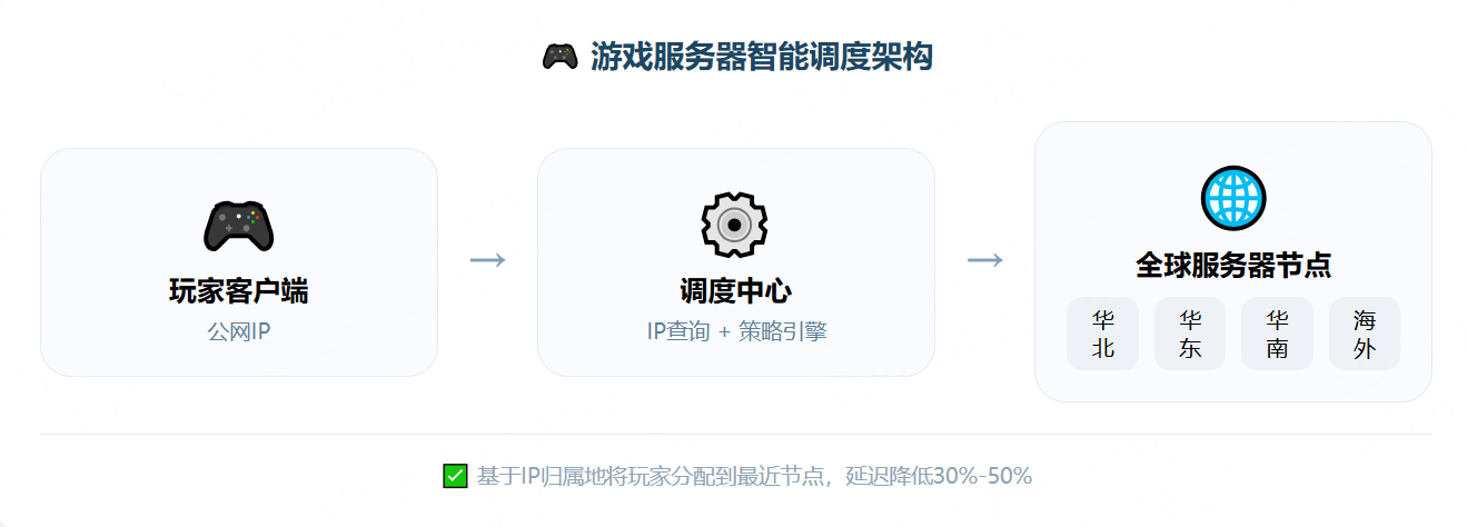 某次游戏版本更新后,运维团队收到大量玩家投诉:华东地区玩家登录后延迟飙升到200ms以上,而华南玩家体验正常。排查发现,新版本上线时调度策略被重置,所有玩家默认分配到了华南的服务器节点。问题的根源在于:调度系统不知道玩家"在哪儿",只能凭运气分配。而解决这个问题的关键,就是IP地址查询------通过获取玩家IP归属地,将用户连接到最近的服务器节点,显著降低网络延迟和丢包率。实测表明,基于IP地理位置的智能调度可将平均延迟降低30%-50%。