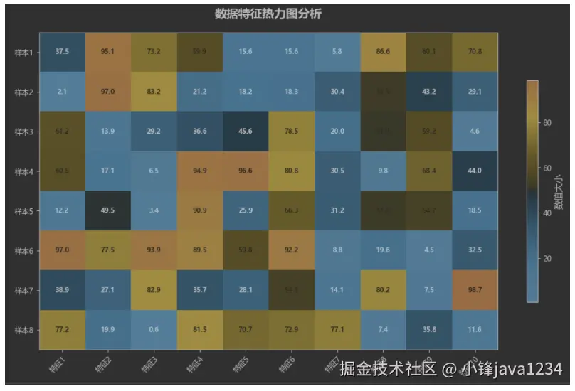 热力图通过色彩变化来展示矩阵中每个单元格的数值大小: