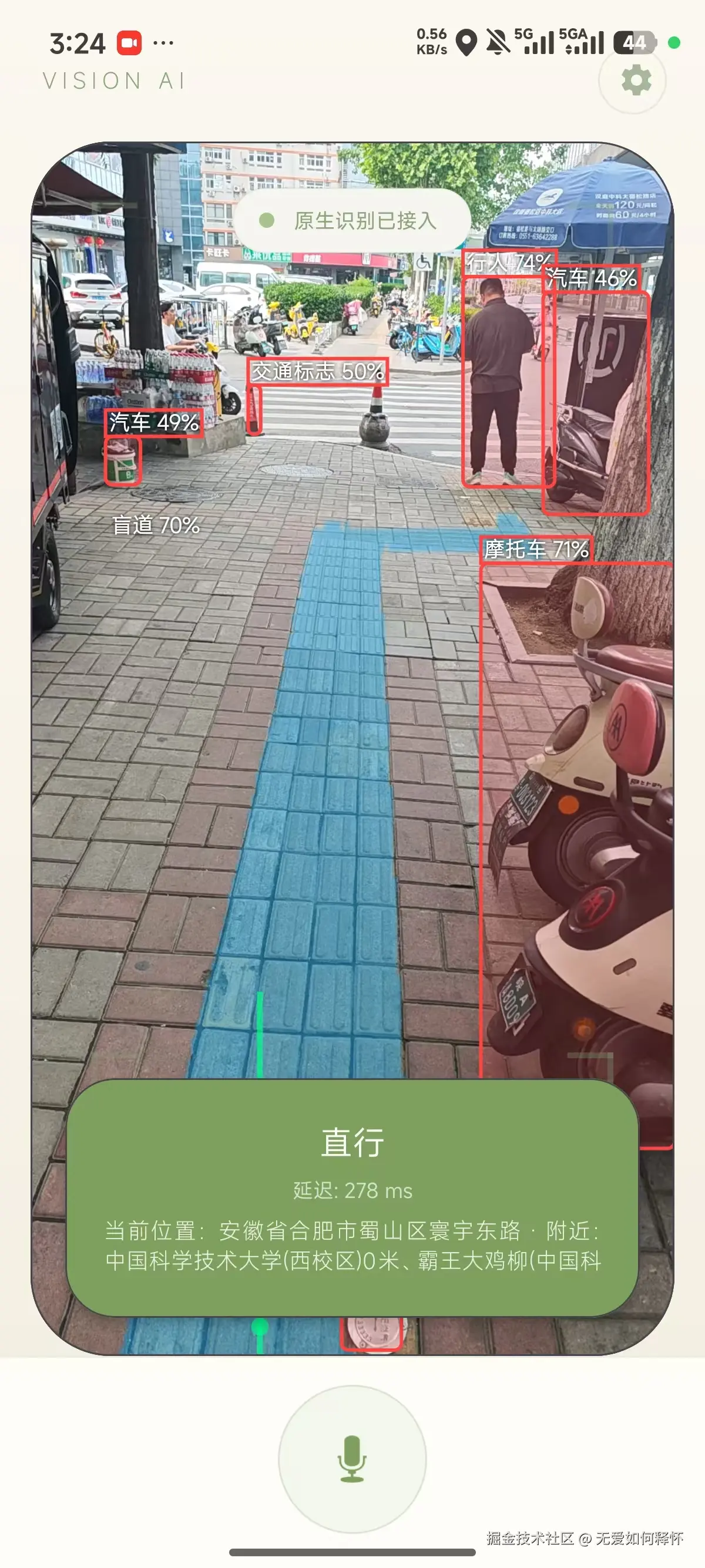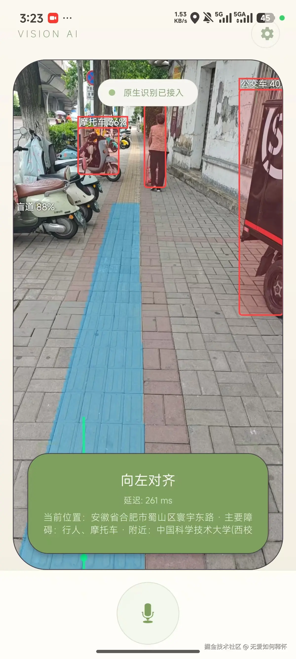 当盲人用户走在路上,手机后置摄像头实时采集画面,YOLOv8模型在端侧跑推理,检测到盲道之后直接引导用户对齐方向。如果前方有障碍物------汽车、行人、电线杆------系统会立刻预警。