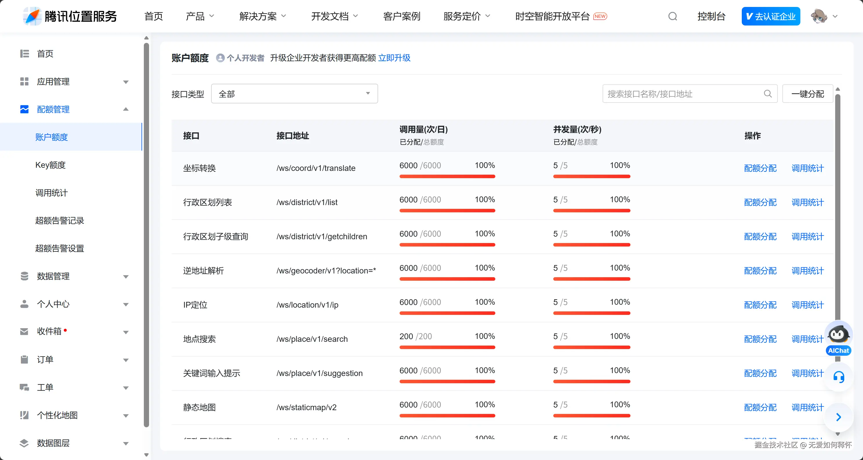 申请完之后,记得去控制台点一下"一键分配"。这句话我加粗了,因为我当时就忘了这一步,导致调试阶段一直报错,排查了半天才发现是额度没分配。