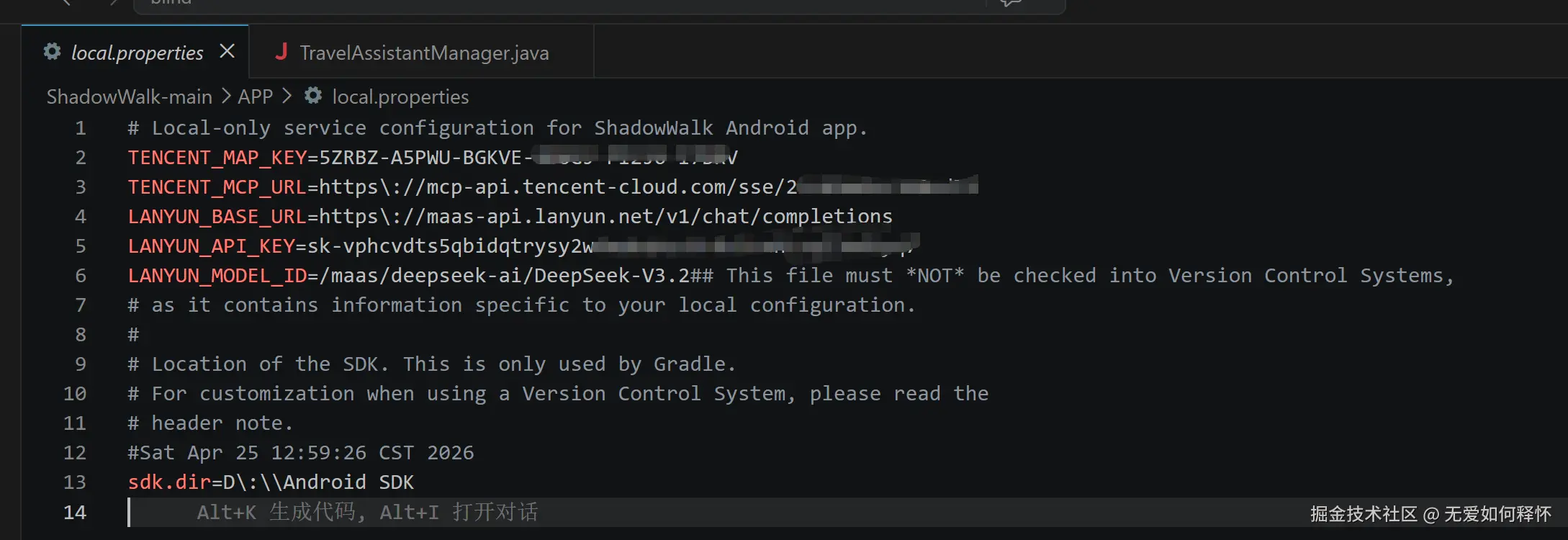 很多新手直接把API Key写死在代码里,然后推到GitHub上------这是大忌。我这边用的是Gradle + local.properties的方案,密钥只存在本地,不会进入版本控制。