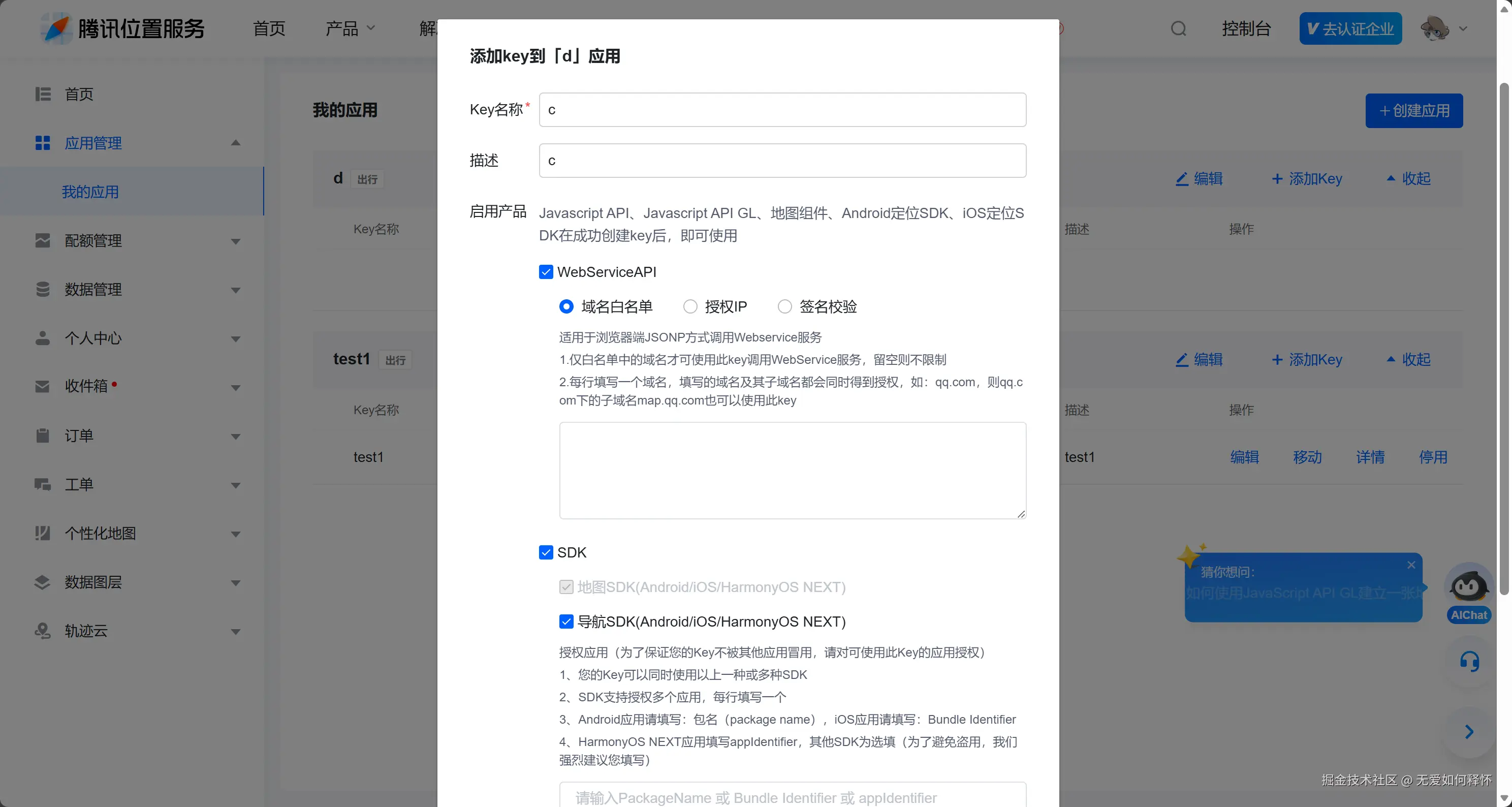 打开腾讯云位置服务控制台,创建一个应用,把SDK和WebService API两个选项都勾上。注意,光勾SDK是不够的,我们后面要用WebService API做逆地理编码,如果不勾的话请求会直接被拒。