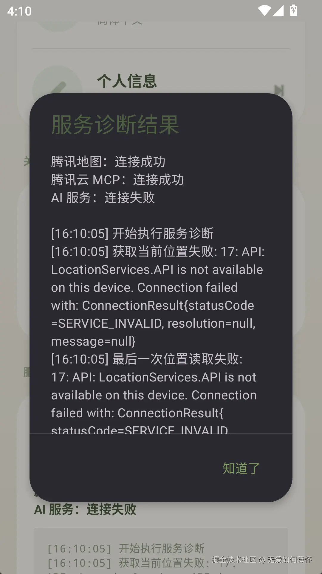 诊断结果会以弹窗的形式展示,告诉你哪个服务连接成功、哪个失败了、失败的原因是什么,还会附带完整的日志时间线。