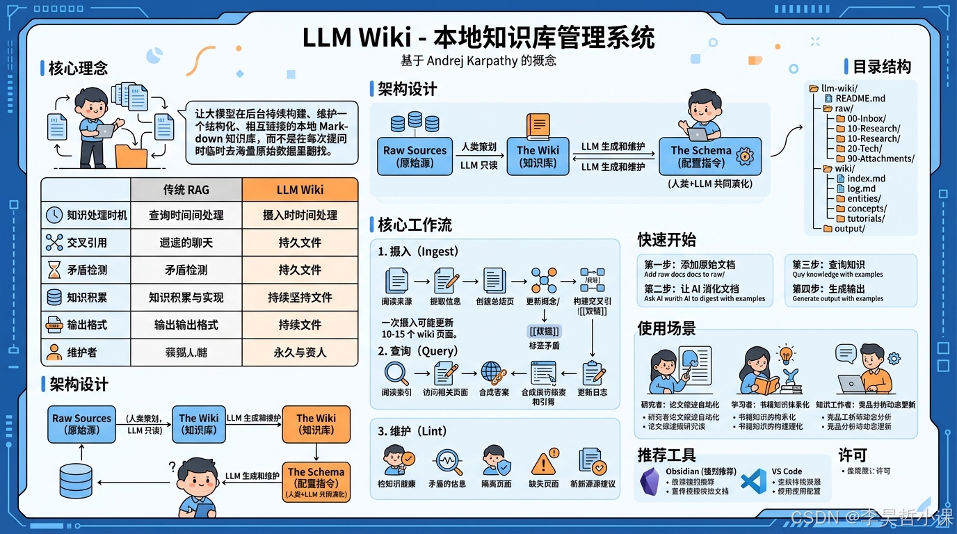基于 Andrej Karpathy 提出的 LLM Wiki 理念,这是一个由 AI 自动维护的结构化本地 Markdown 知识库。