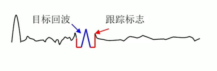 - 图中展示了典型的跟踪标志与目标回波的关系:跟踪标志(红色框选的波形)始终对准目标回波(蓝色箭头),两者的位置差会被用来驱动距离跟踪系统调整波门位置。