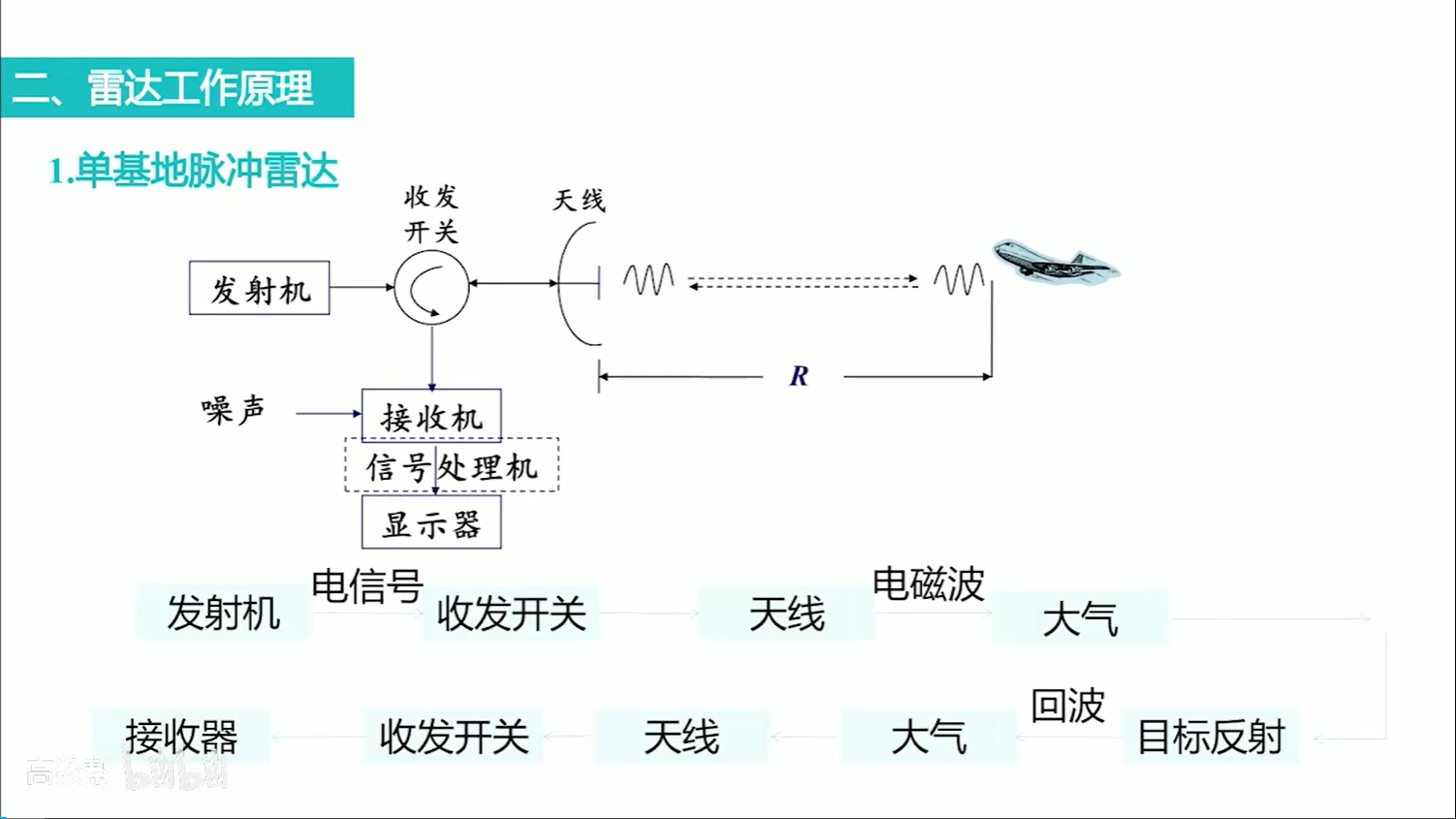 - 大气传播:电磁波在大气中以光速传播,遇到目标后反射