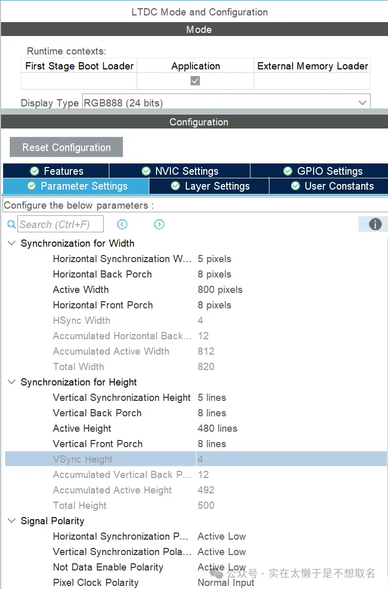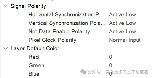 根据自己的屏幕参数来设置LTDC的刷新参数,最后3个参数RGB用于设置背景层参数。