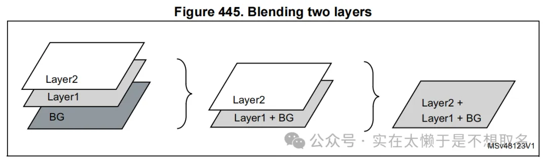 LTDC总共有一个背景(BG)和两个层(Layer)组成,三者融合后作为最后的显示内容。