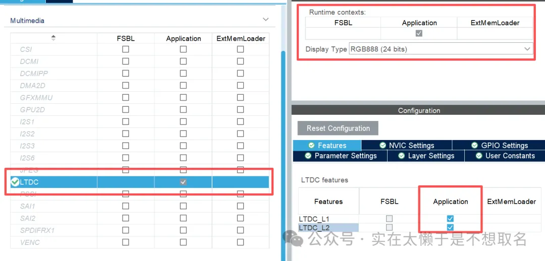 首先勾选LTDC的两个层,刷新方式我们选择RGB888(根据自己的LCD显示屏幕修改)。