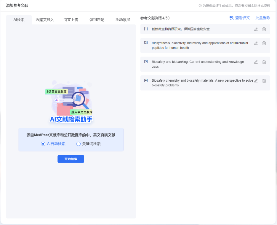 最省时间的就是文献功能了,它对接了3亿+中英文文献库,支持五种添加文献的方式:关键词检索、AI自动检索都可以,不用你自己一个个整理参考文献格式,把你耗在找文献上的时间直接省出来。
