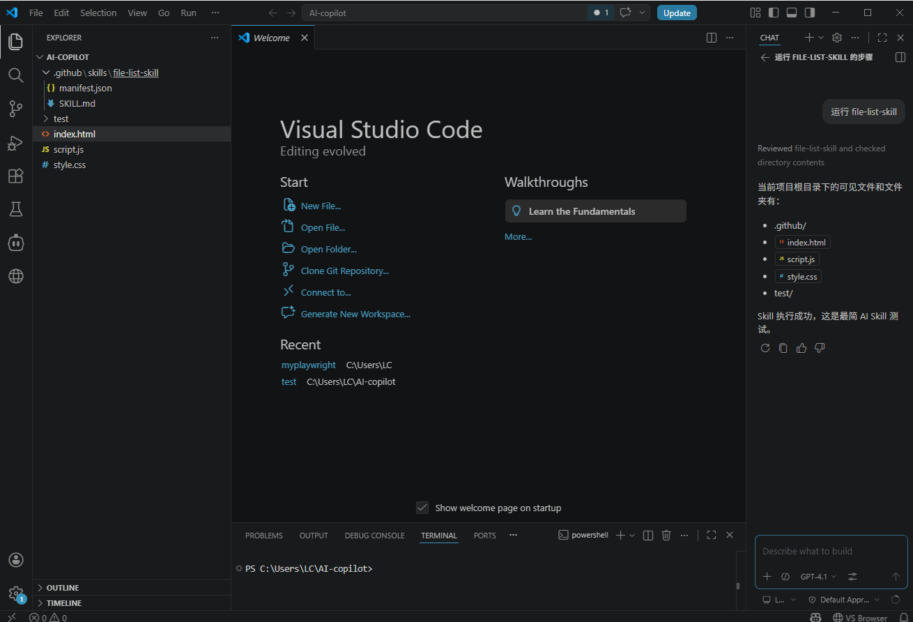 重启 VS Code(确保 Copilot 加载 Skill),打开 Copilot 聊天窗口(快捷键 Ctrl+Alt+I),打开该项目;