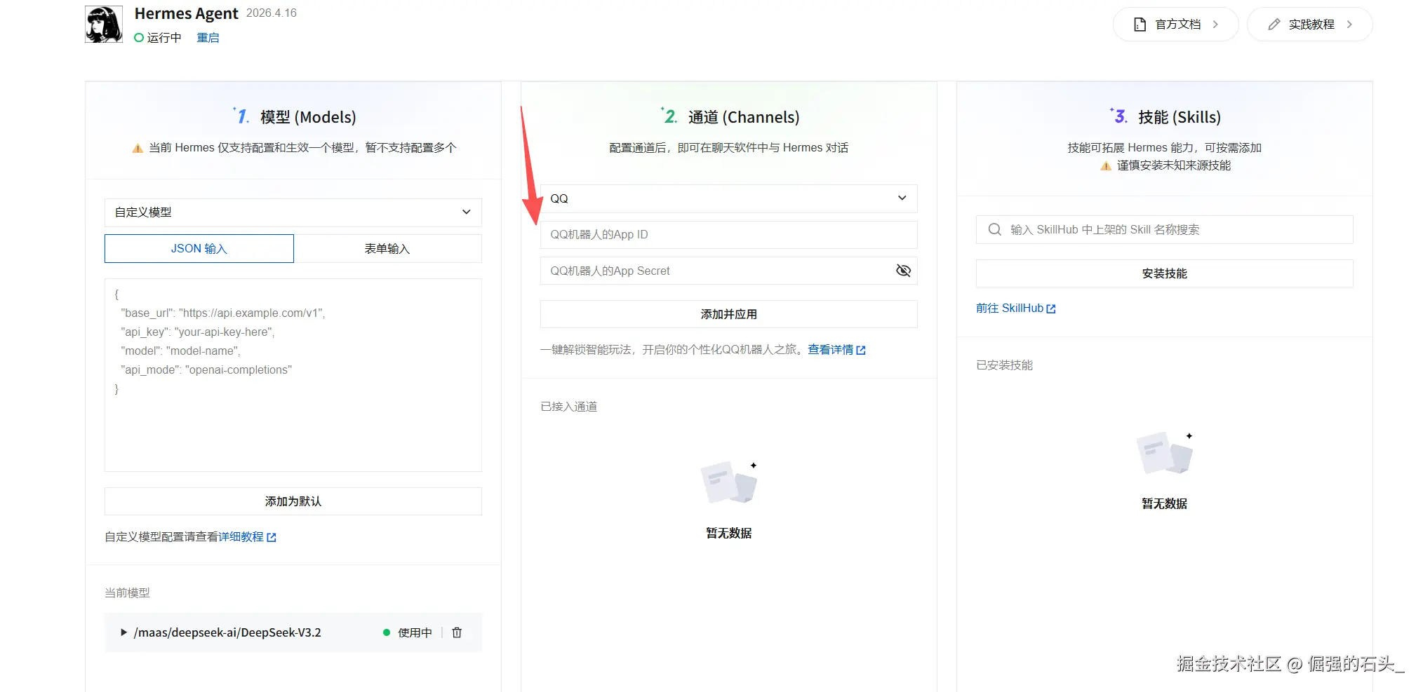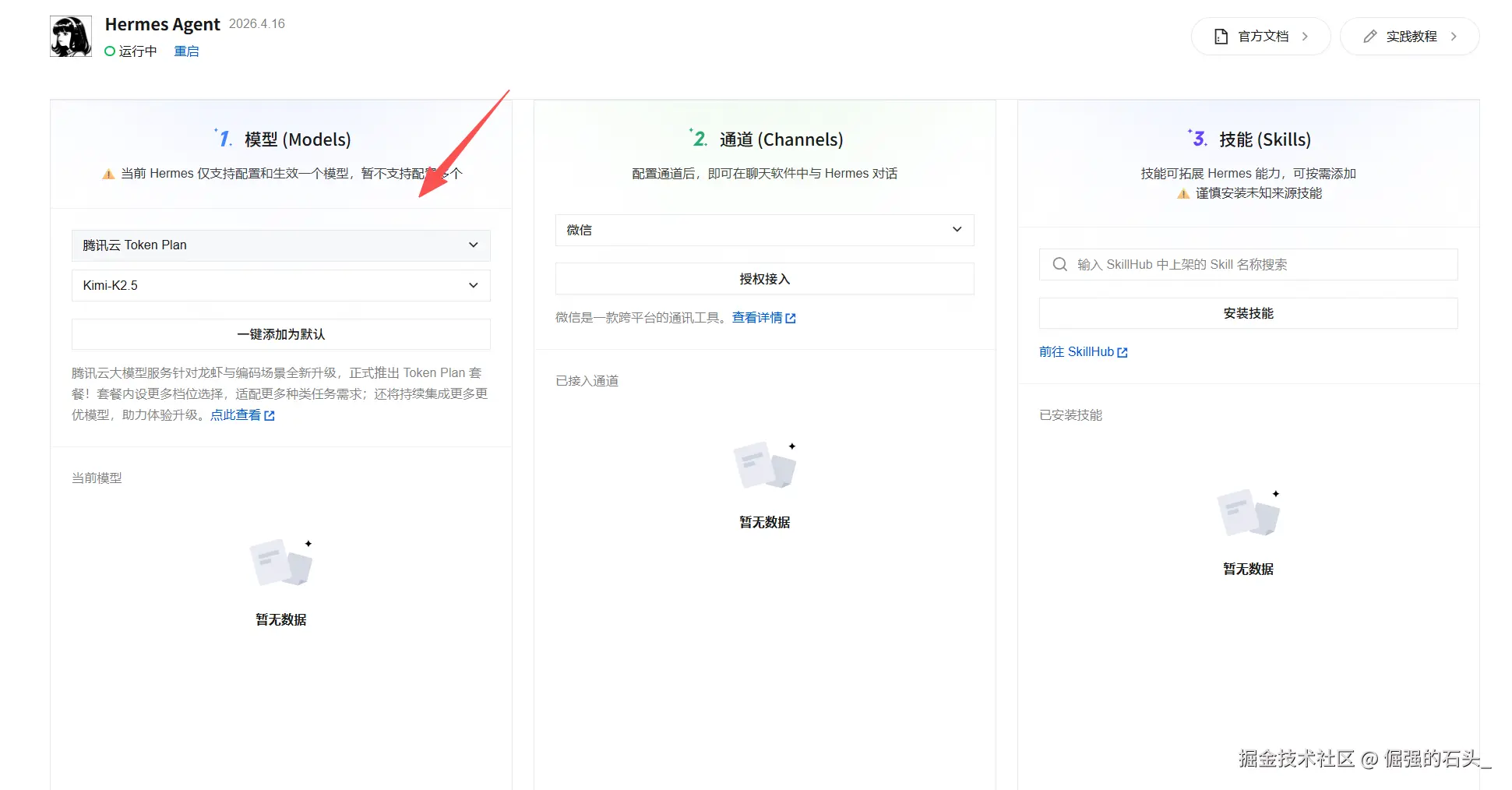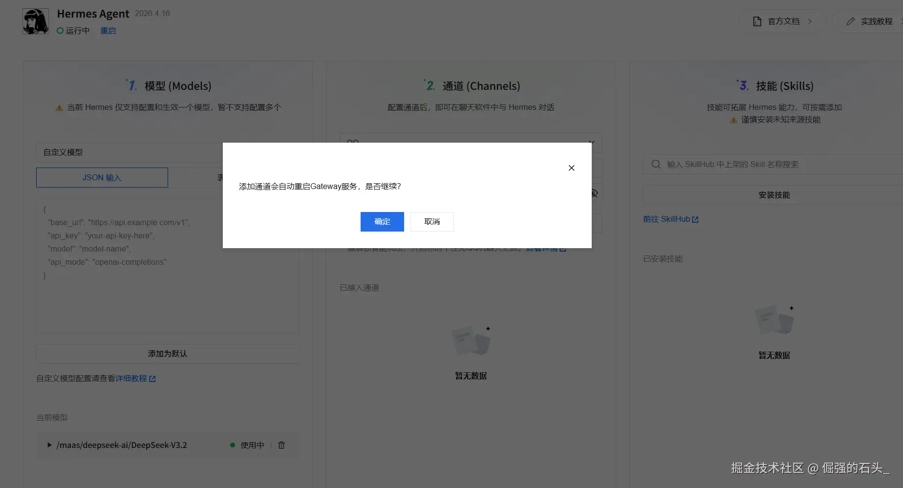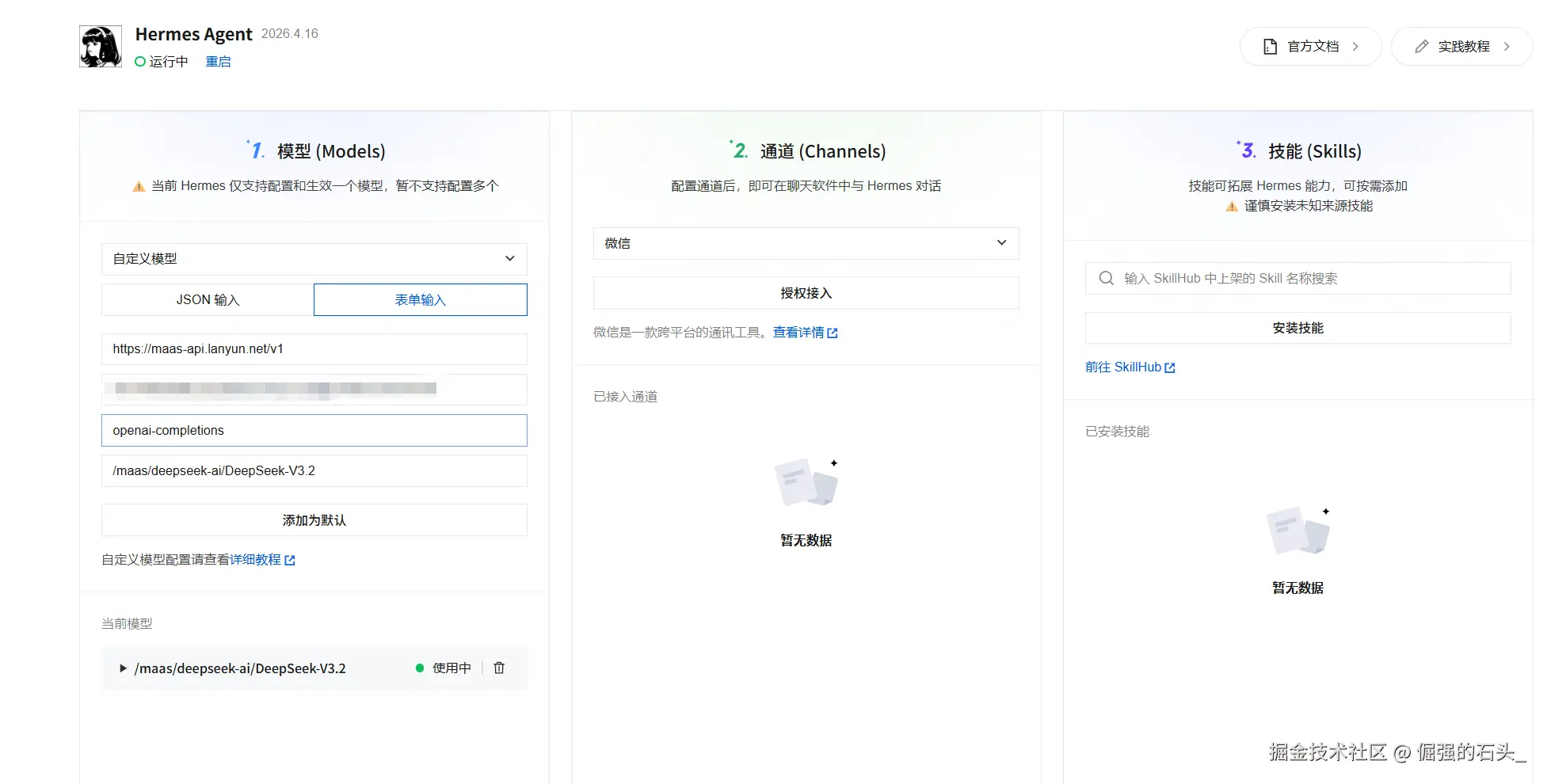 进入 Hermes 的后台面板,我们需要将它的"大脑"替换为蓝耘MaaS提供的 模型