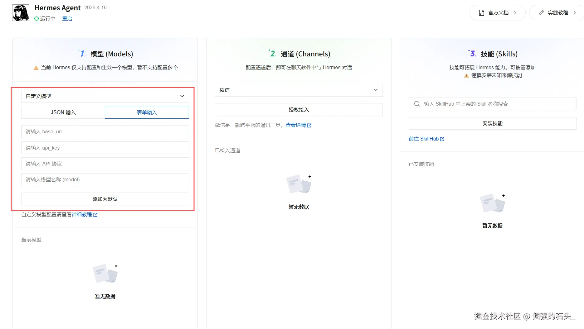 根据官方文档,Hermes 支持"JSON 输入"和"表单输入"两种配置方式。这里推荐直接切换到 表单输入 ,并严格对照蓝耘的模型参数进行填写:
