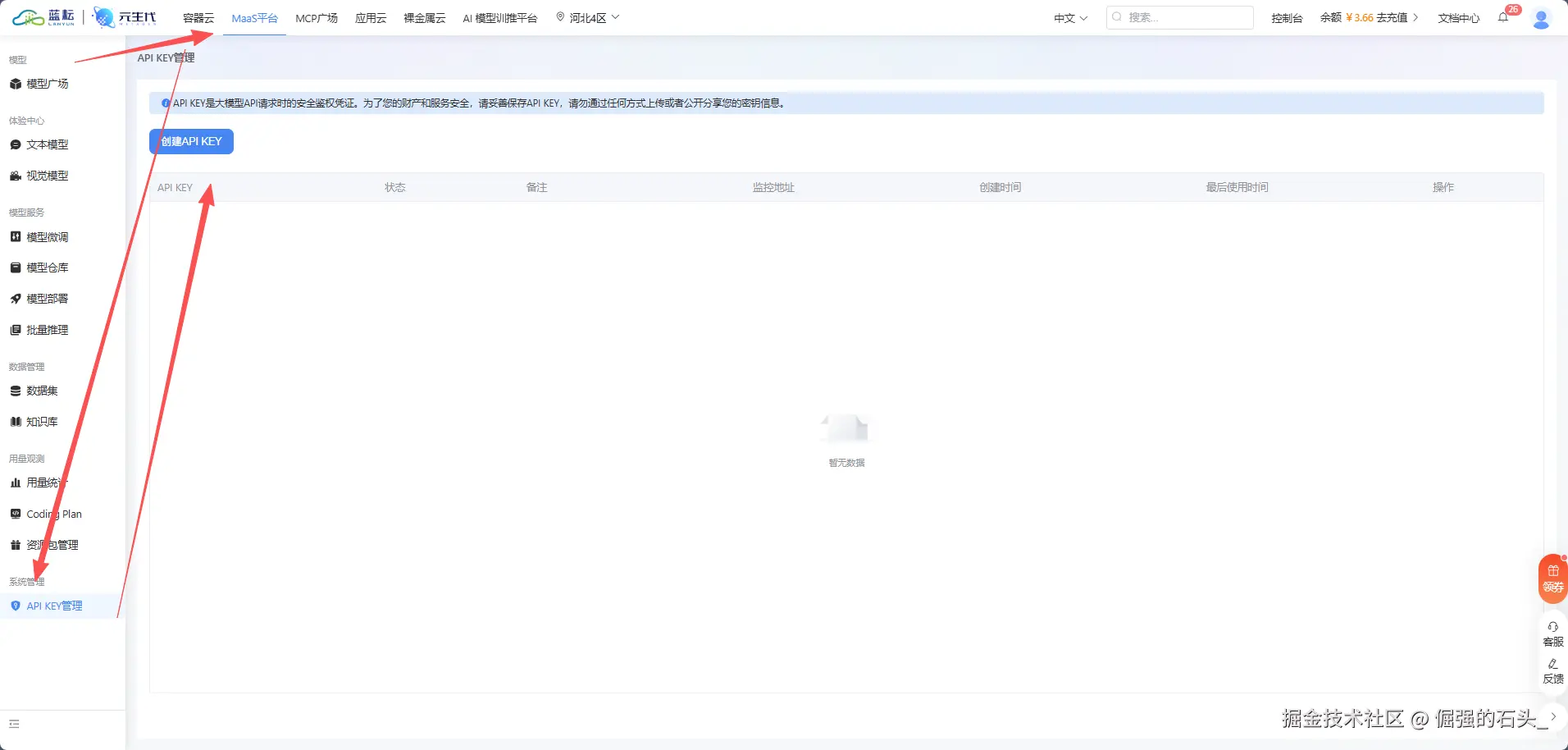 获取 API Key :在左侧导航栏找到 API管理 / 密钥管理 ,点击"创建 API Key"。