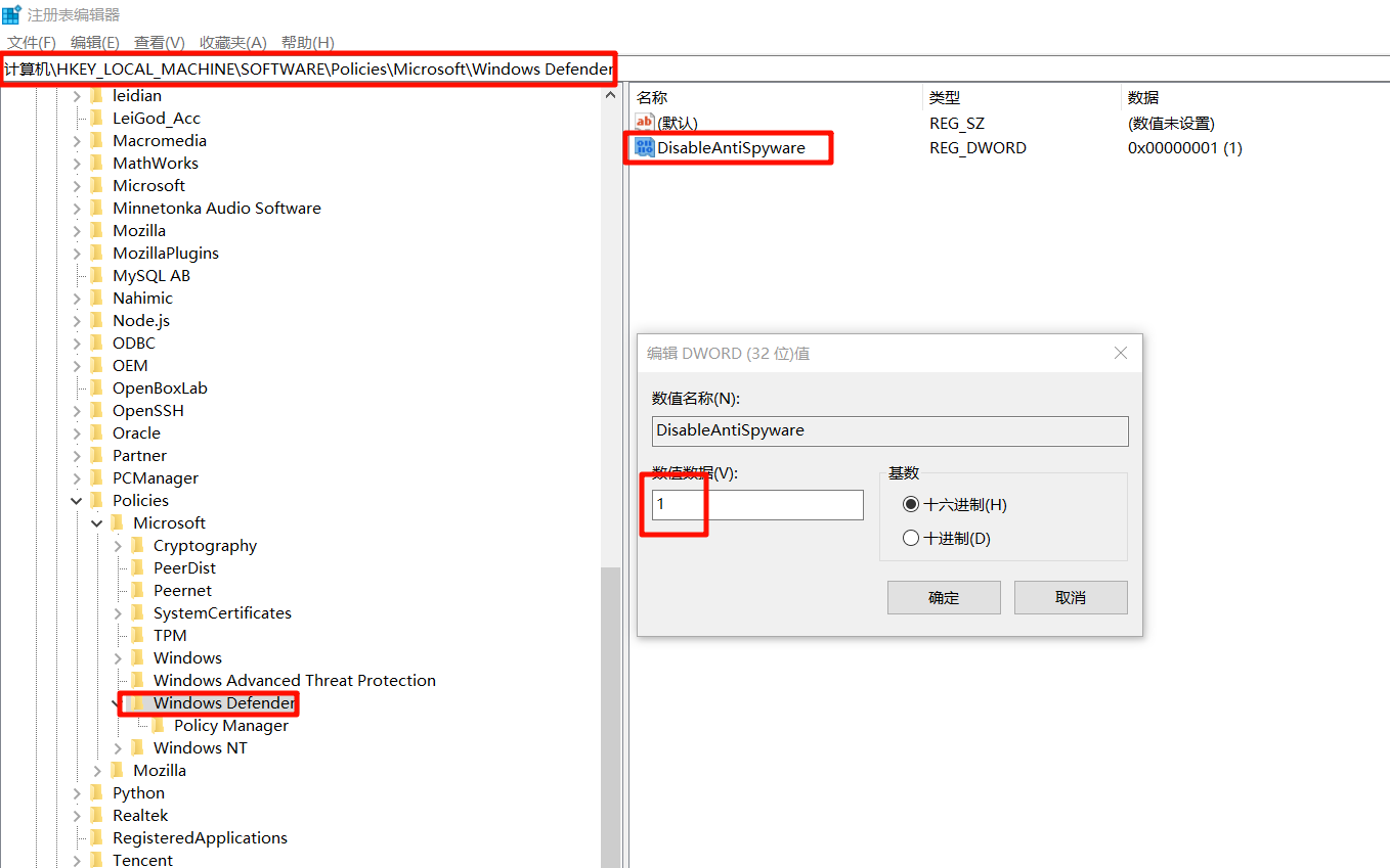 输入reg add "HKEY_LOCAL_MACHINE\SOFTWARE\Policies\Microsoft\Windows Defender" /v DisableAntiSpyware /t reg_dword /d 1 /f