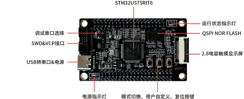 STM32U5核心板采用STM32U575RIT6微控制器,基于32位Cortex-M33内核,运行频率可达160MHz,内部Flash容量为2MB,RAM容量786KB。核心板采用最小系统设计,板载16MB的Flash存储器,用于存储大容量数据。供电端口采用USB TypeC接口,板载USB转UART芯片,用于ISP功能或串口调试。核心板提供复位、BOOT与用户按键,提供2.8寸电容触摸屏接口。核心板提供电源指示灯与运行指示灯(用户编程控制)。