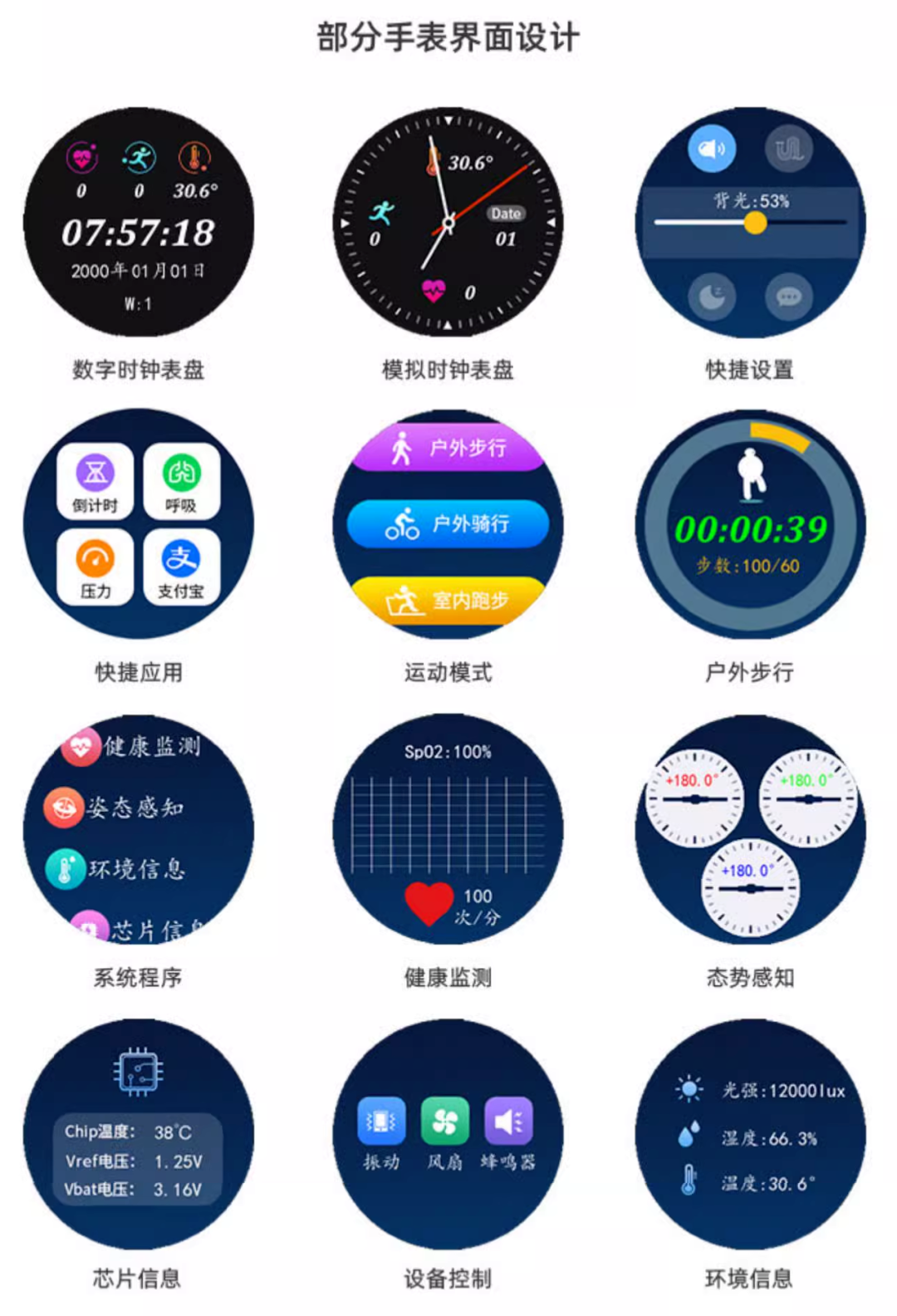 - 健康监测:表盘页面显示心率、步数、温度、日期等信息。