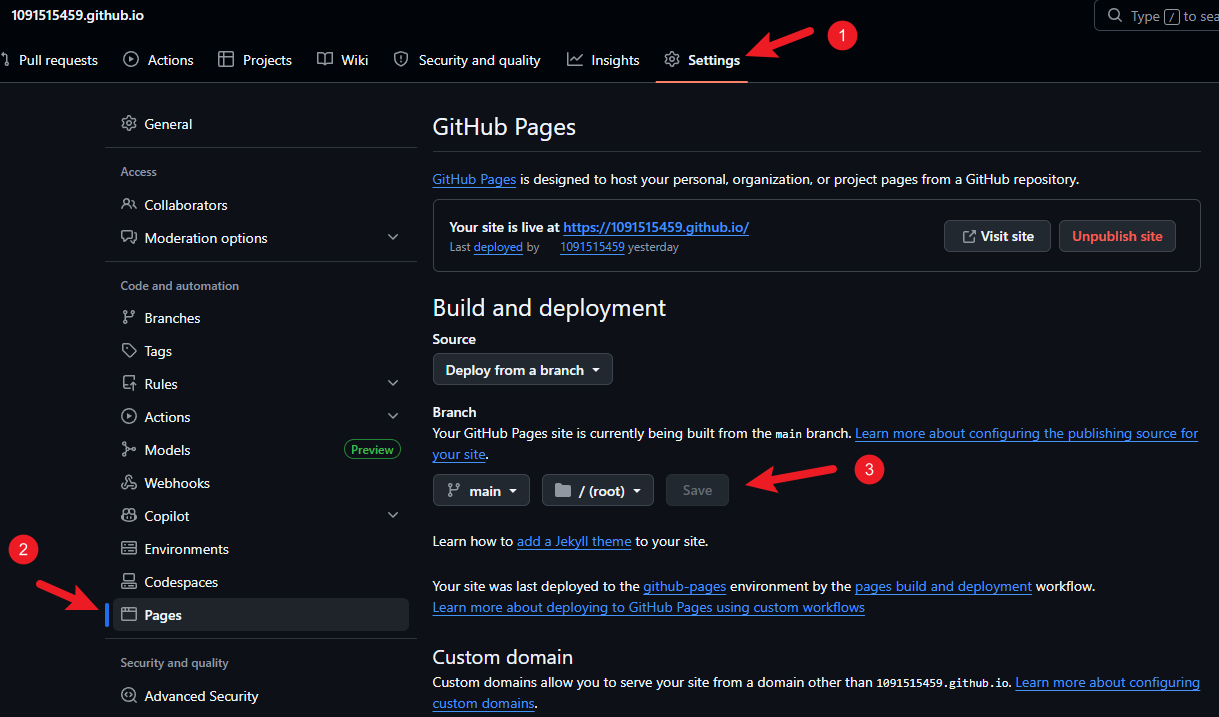 3、按照如下图所示Settings-》Pages-》选一个分支Save(如果你就想root这整个第三步都可以省了)