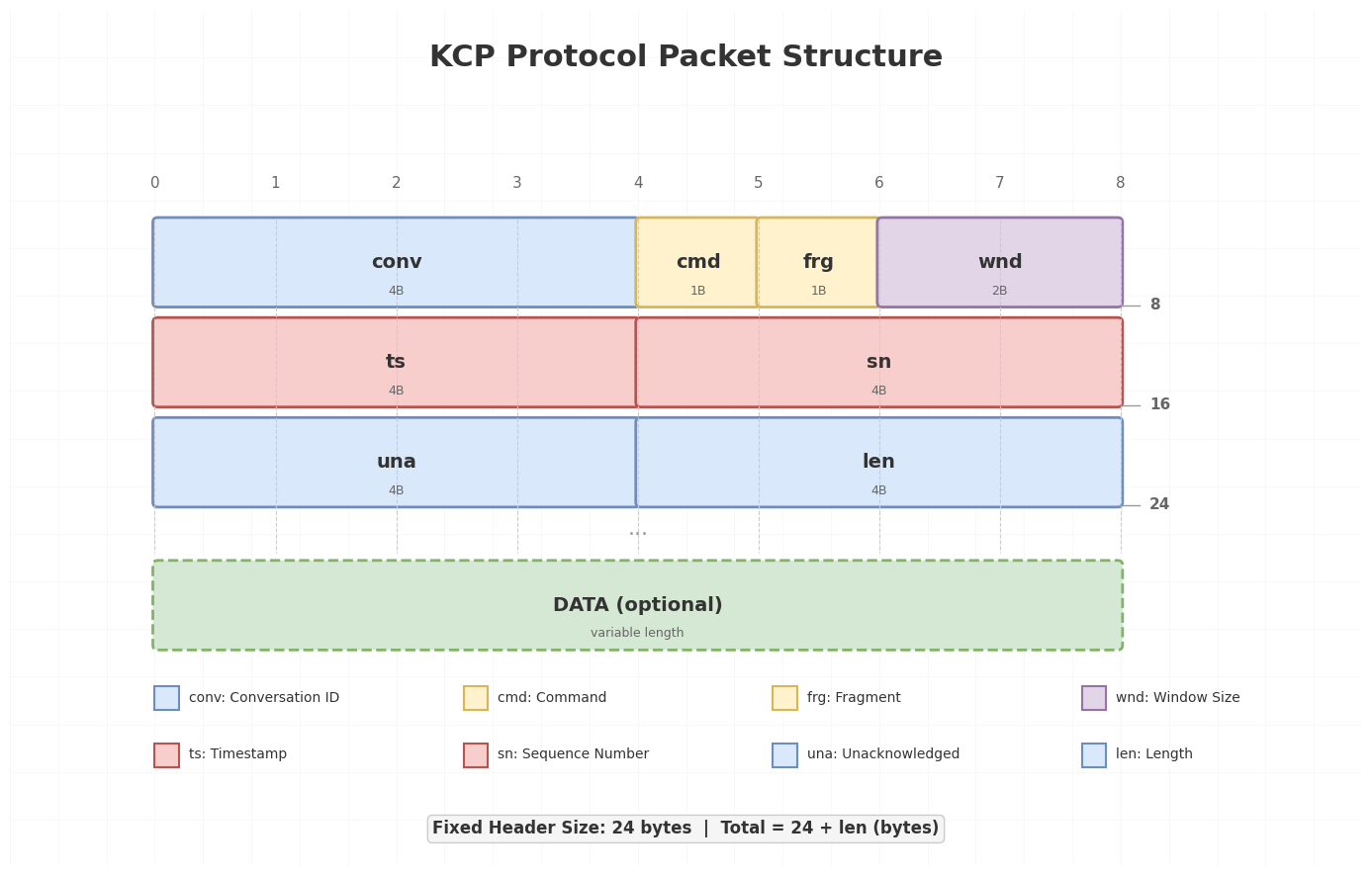 KCP 则走了另一条路。它不做"操作系统的一部分",而是做"你代码里的一部分"。它以 UDP 为底,在用户态重新实现了一套可靠传输算法,把控制权完全交给开发者 。通过更激进的 RTO 计算(×1.5 而非 ×2)、选择性重传、无延迟 ACK、以及可配置的窗口和时钟,KCP 在弱网、高丢包、高抖动的环境下,把"偶尔卡顿 600ms"变成了"稳定慢 30ms"。