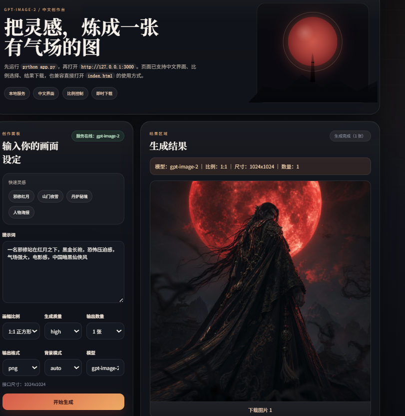 这个是我的apikey:sk-1cdcb37af4bb729eab8983f3ea08f158c01737672581de07db6839bcf9d16545 这个是我的url地址:https://token.zhilu.online/v1 现在我需要gpt-image-2模型,来生成一个图片生成网站。 使用html+css+js即可,生成一个网页,调用这个模型,需要支持选择比例生成
