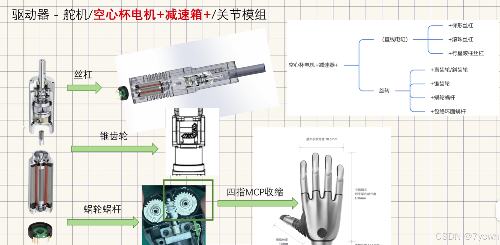 | 腱绳执行单元类 | 电机 + 减速箱 + 卷线轮 + 腱绳 | 远程拉动手指关节 | 腱绳驱动、仿生灵巧手 | 手指轻、结构紧凑、仿生效果好 | 绳索松弛、弹性变形、维护调试麻烦 |
