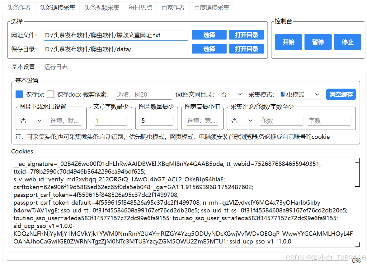 网页模式 :驱动谷歌浏览器进行渲染采集。使用网页模式时必须填入自己的头条账号 Cookie,因为许多链接需要登录后才能访问,否则会跳转到登录页面。