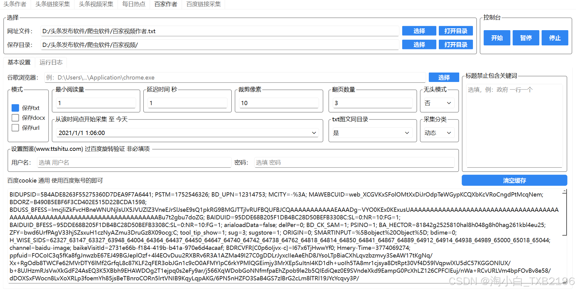 打开目标百家号作者的主页网址按行存入 TXT 文件,然后通过「选择」按钮加载该文件。