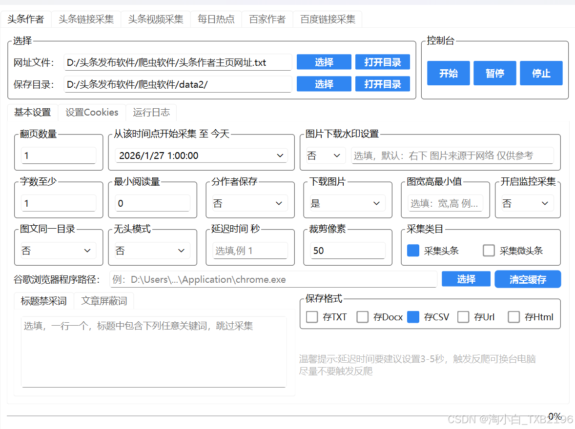 基本选项(保存目录、保存格式、图片裁剪、图文同目录等)与头条链接采集相同。
