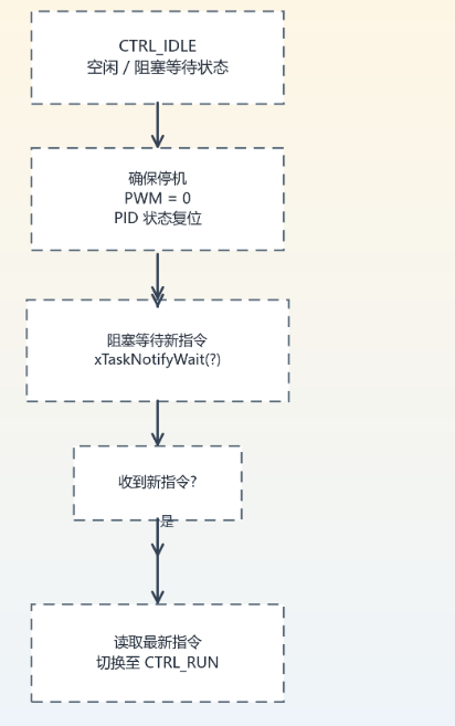 初始状态: ControlTask 处于 CTRL_IDLE 模式,通过 xTaskNotifyWait 无限期阻塞等待,此时电机输出刹车 PWM,系统功耗极低。