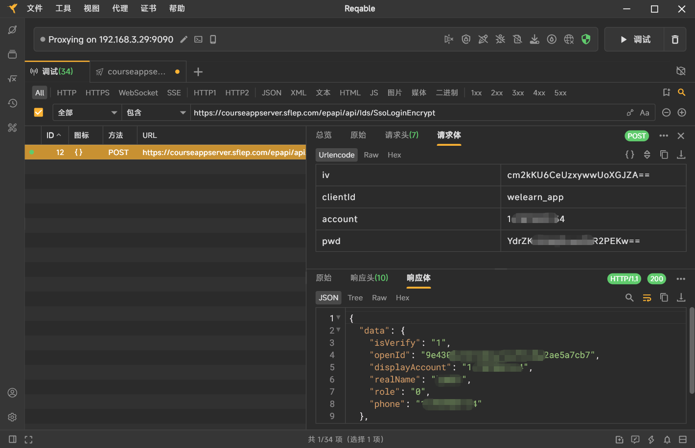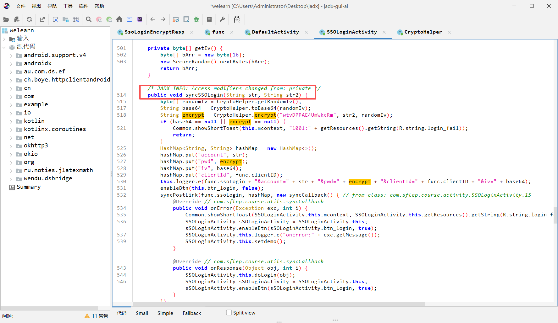 将脱壳后的Dex导入Jadx,搜索关键词login、pwd等,定位到登录Activity中的核心方法syncSSOLogin。
