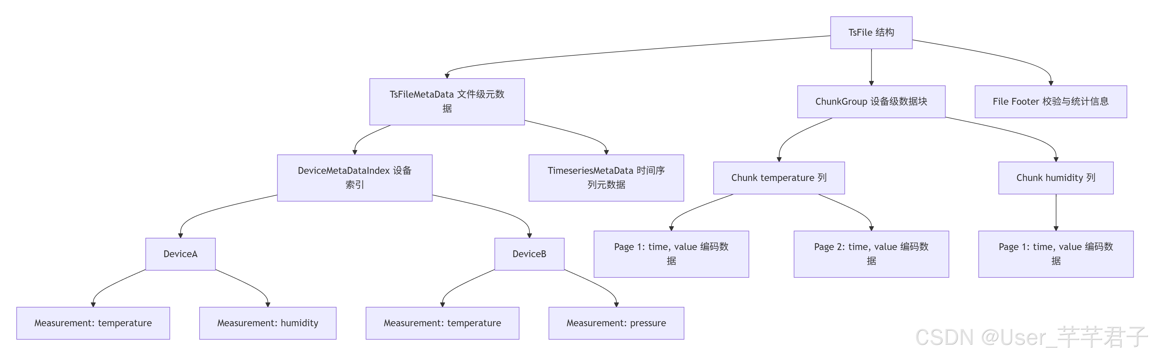 Apache IoTDB 自研了 TsFile 存储格式,采用列式存储与多级编码压缩。TsFile 的一个设计特点是数据按设备和时间双维度组织,天然适配物联网场景中"每个设备独立采集、时间连续"的数据分布特征。